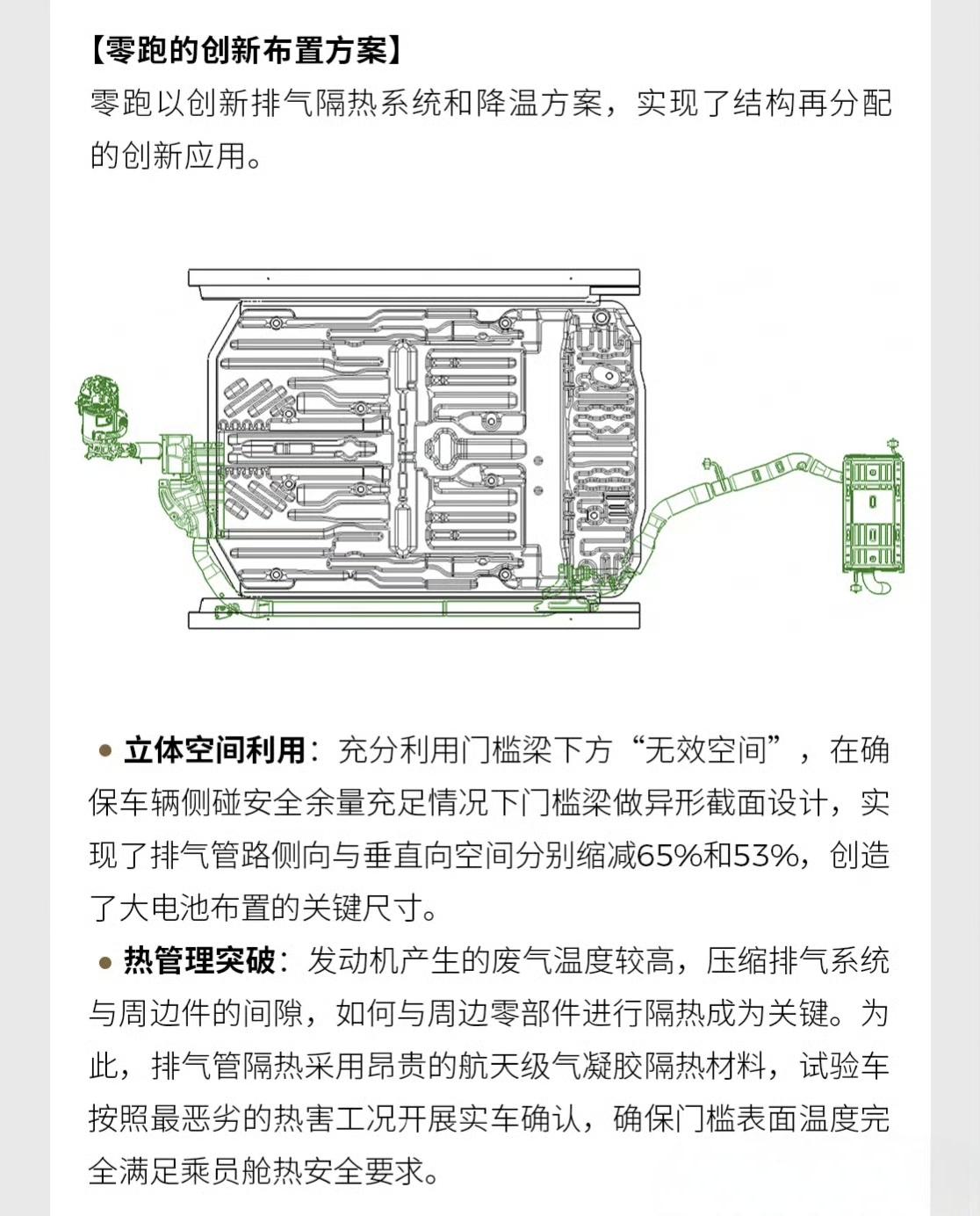 零跑D19排气管集成在门槛梁下,引起了一定的争议。看着是个大胆突破传统的设计,会不会有很多没考虑到的事项? 图1,图2: 从图1可以看到,排气管其实就放在门槛梁的侧下方,是独立出来的,而不是集成在门槛梁里面,排气管沿着电池走到后方尾气后处理装置。 可维修性这块,其实还行。 图3: 零跑交代了这种创新设计会有【侧碰安全余量不足】的问题,以及【热害问题】。 这里零跑交代了侧向安全余量留足了,以及用了航天级气凝胶隔热材料,按照最恶劣的工况测试过,对门槛表面温度影响有限。 这里虽然没有实测数据,不过看上去我们能想到的和担心的,他都说了。【来自懂车帝车友圈】