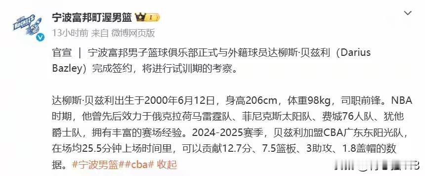 浙江宁波官宣前广东宏远外援贝兹利加盟,贝兹利也是深受广东宏远球迷喜欢的一名外援,贝兹利弹跳能力不错能扣篮防守也行,就是做为内线尺寸不足对抗差,这个赛季的宁波可以是一匹黑马了,第二阶段贝兹利又加盟成绩又要起飞了。 今天还有传言辽宁男篮要辞退外援威尔斯,毕竟辽宁男篮第二阶段后场引进了两名球员,威尔斯在第一阶段后期也是有伤在身,辽宁男篮还缺一名大外援,辽宁男篮为了节省资金空间裁掉威尔斯也不是不可能的