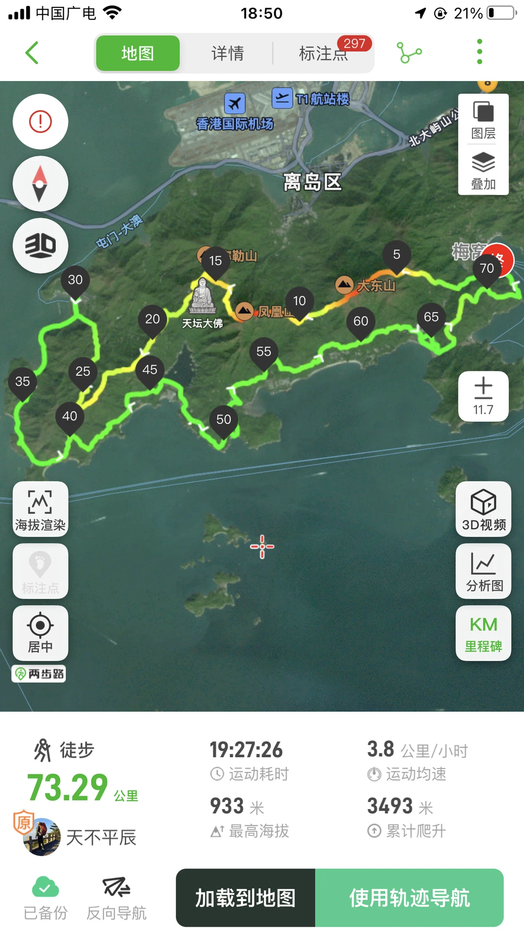 D1:梅窝码头→昂坪营地,里程14.16公里,爬升1518米,下降1067米,耗时8小时01分。