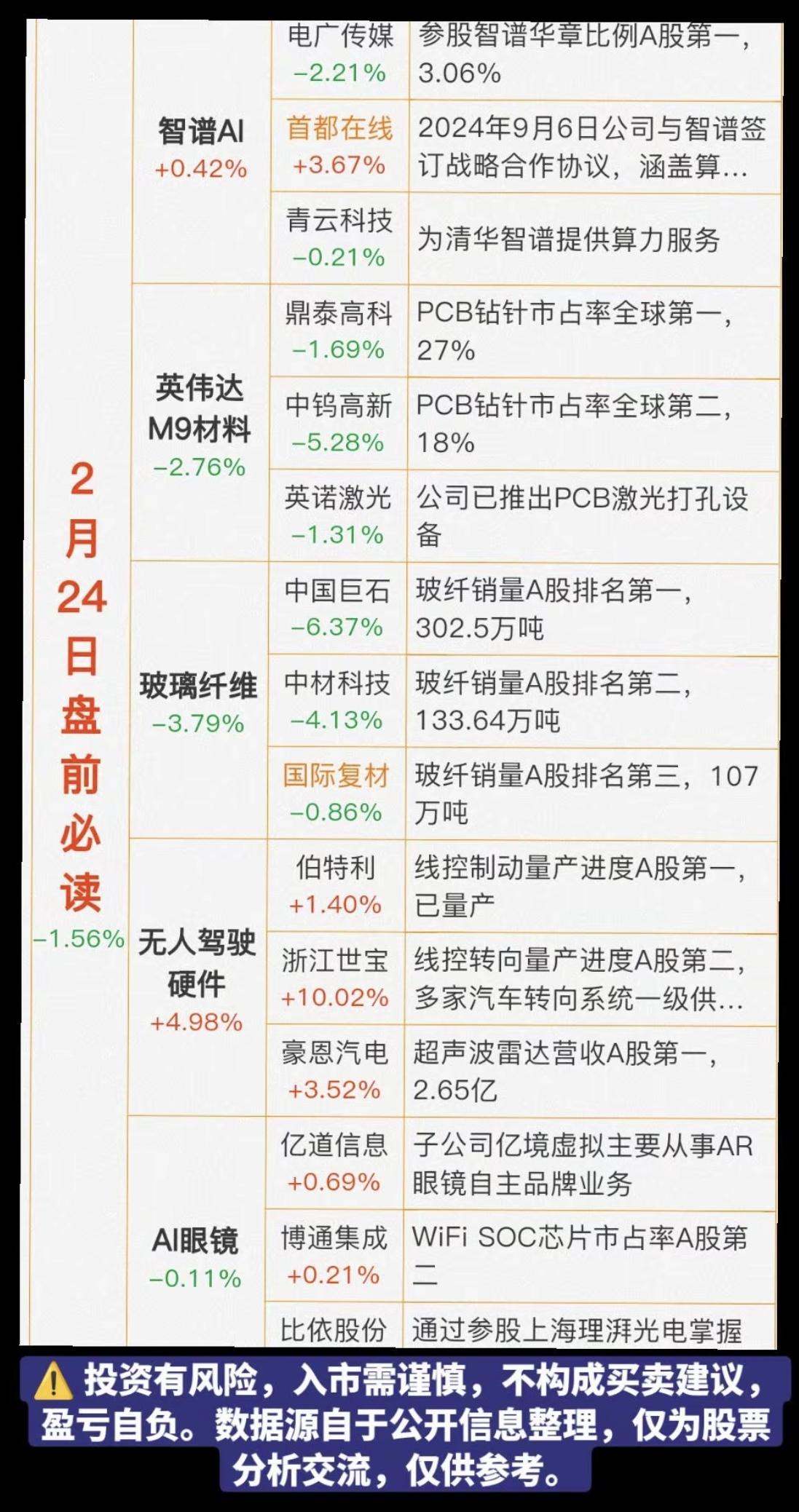 2.24周二 盘前 财经热点必读! 1.智谱AI,AI眼镜 2.英伟达M9材料 3.玻璃纤维 4.无人驾驶硬件 5.光纤光缆