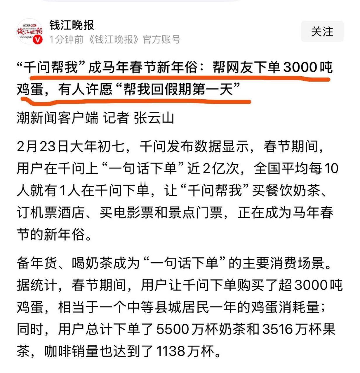 今年春节出现一个明显变化,背后释放的信号不简单! 不知道大家发现了没有,今年春节用千问,通过千问办事的人越来越多了。这一点,除了身边的人用千问的越来越多之外,数据体现的也很明显,整个春节,全国一共说了2亿次千问帮我,平均每10个人中,就有1人在千问下单。 这意味着 AI 办事已经不是少数人的新鲜玩法,而是走进了千家万户的全民选择,是刻在今年春节里的新民俗。 以前我们总觉得,智能工具是年轻人的专属,可今年春节彻底打破了这个固有印象,千问真的做到了让各个年龄段的人都能用、都会用、都爱用,这才是最让人惊喜的改变。 年轻人用千问,早就成了日常习惯,今年春节更是把方便发挥到了极致。朋友聚会的时候,不用一个个点开软件手动选品、付款,只要随口说一句 “千问帮我点 10 杯奶茶”,几秒就能下单成功。 春节档电影火到一票难求,不用熬夜刷票、纠结座位,说一句 “千问帮我买附近影院的电影票”,就能直接选好场次和座位;出门旅游逛景点,不用提前做攻略、找票务,一句 “千问帮我订景点门票”,就能轻松搞定入园凭证,数据里能看到。 今年春节用千问买电影票的订单环比增长了 372 倍,买景点门票的订单更是暴涨 22 倍,5500 万杯奶茶、3516 万杯果茶、1138 万杯咖啡,都是大家通过千问一句话下单的,这些实实在在的数字,就是年轻人喜欢千问最好的证明。 对年轻人来说,千问省去了所有复杂的操作,不用记步骤、不用找按钮,想说什么就说什么,把时间都留给过年的开心和团圆,而不是耗在繁琐的操作上,这就是最简单也最实在的幸福。 如果说年轻人用千问是意料之中,那今年春节最让人意外、也最能说明变化的,就是无数中老年人也加入了用千问的队伍,这才是今年春节最大的突破,也是最有意义的改变。 我们都知道,以前很多长辈面对智能手机,总是犯难,看不懂复杂的图标,记不住繁琐的操作步骤,想点个外卖、买个年货、交个水电费,都要等着子女帮忙,有时候子女不在身边,就只能干着急。 可今年春节,一切都不一样了,数据显示,有超过 400 万的 60 岁以上用户,都通过千问帮忙下单办事,还有 156 万银发族是第一次用 AI 点外卖,这个数字真的太有说服力了,它意味着曾经被数字技术落在后面的长辈们,终于也能轻松跟上智能生活的脚步。 更让人觉得暖心的是,千问的普及不分城市和乡村,今年春节近半数的 AI 订单都来自县城和乡镇,从大城市的繁华街区,到小县城的温馨小巷,再到乡村的农家小院,到处都有 “千问帮我” 的声音。 备年货、买日用品、订出行票,不管是生活里的小事,还是出行中的大事,千问都能一一搞定,春节期间用户通过千问买的鸡蛋就超过 3000 吨,相当于一个中等县城居民一年的鸡蛋消耗量。 这些充满烟火气的数据,恰恰说明千问已经融入了普通人的日常生活,不是高高在上的科技产品,而是帮大家解决实际问题的贴心帮手。 今年春节全民用千问的变化,绝不仅仅是一款工具变火了这么简单,它背后释放的信号,关乎我们每一个人的生活,关乎科技的真正意义。 一直以来,我们总觉得科技是冰冷的、高深的,是实验室里的技术,是少数人掌握的技能,可千问用这个春节的真实数据和无数案例告诉我们,最好的科技,从来都是接地气、有温度的,是能让老人小孩都能用、都方便的科技,是能走进柴米油盐、融入团圆时刻的科技。 这个变化意味着,中国的 AI 技术已经真正从实验室走向了千家万户,从技术竞赛变成了民生服务,不再是年轻人的专属玩具,而是全年龄段共享的生活帮手,不管你是十几岁的学生,还是七八十岁的老人,都能平等地享受科技带来的便利,这就是科技普惠最真实的样子。 春节是一家人团圆的日子,也是最能体现生活幸福感的时刻,今年因为千问的出现,团圆变得更温馨、更轻松。 晚辈不用再一遍遍耐心教长辈怎么使用手机,长辈不用再因为不会操作而感到无助,每个人都能轻松搞定自己的事,把更多时间用来陪伴家人、享受年味,这就是科技给春节带来的最好改变。 2 亿次 “千问帮我”、400 万银发用户、每 10 个人就有 1 人使用,这些数字不是冰冷的统计,而是无数人生活变方便的证明,是全民拥抱智能生活的开始。 我真心觉得,今年春节这个用千问的变化,看似平常,实则意义重大,它标志着 AI 办事的时代真的来了,标志着科技终于彻底走进了普通人的烟火生活,未来,千问会成为我们生活里离不开的帮手,会让更多人感受到智能生活的美好。 这个春节的新变化,让我们看到了科技的温度,看到了生活的便利,更看到了全民共享幸福生活的新趋势,这样的变化,真的不简单,也值得我们每一个人期待。