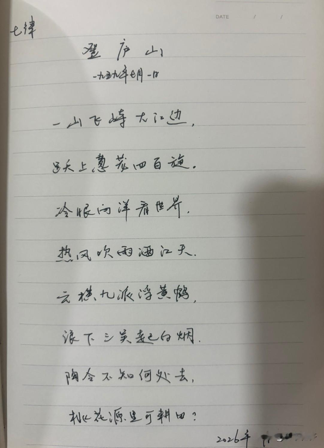 抄书第 1097天(2026年2月23日) 静心✔ 戒浮躁,一笔一划。 今天继续抄《毛泽东诗词集》之《七律·登庐山》,这首词作于1959年7月1日,是毛主席登上江西庐山后创作的山水诗佳作。 这首诗写于庐山会议前夕。这首诗既描绘了庐山的雄伟壮丽,也抒发了诗人的豪迈情怀。抄抄书 练练字 静静心 抄书打卡