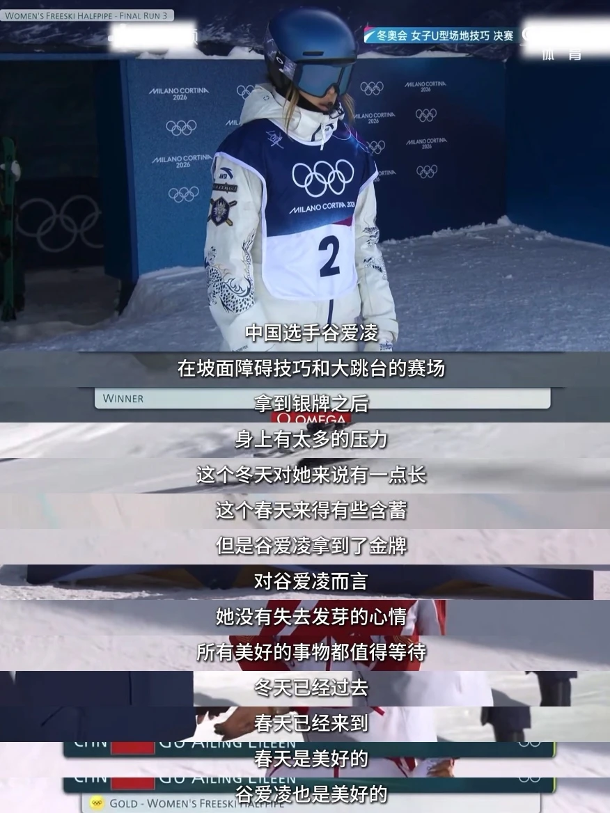 “这个冬天对谷爱凌来说有点长,这个春天来的有些含蓄,但是谷爱凌拿到了金牌。”