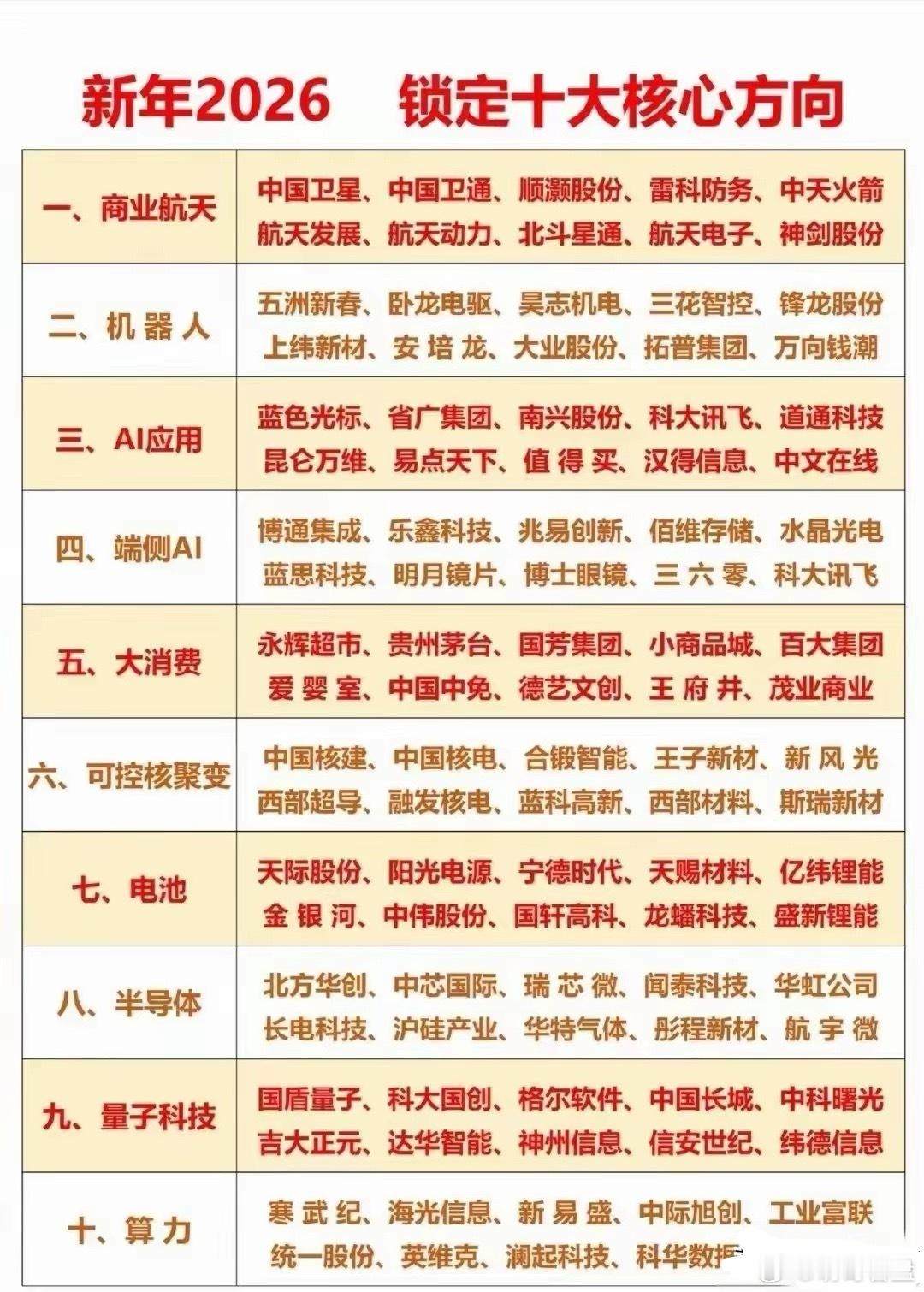 2026年十大核心赛道!认真看懂这篇,把握产业发展新风口一、商业航天 🚀2026年,我国商业航天正从“组网建设”向“规模化应用”加速过渡。随着可回收火箭技术的迭代,发射成本有望持续下探,卫星互联网、低轨星座等项目进入密集部署期。- 市场发展:行业整体进入“技术验证+场景落地”并行阶段,火箭制造、卫星终端、地面应用等全产业链环节持续扩容。- 应用前景:在遥感测绘、导航增强、通信覆盖等领域的应用逐步深化,同时带动航天材料、测控通信等细分领域的技术突破与市场拓展。二、机器人 🤖2026年,机器人产业的核心逻辑是“成本下降+场景渗透”。核心零部件国产化率提升,推动整机成本进入更具竞争力的区间,为规模化落地创造条件。- 市场发展:工业机器人、协作机器人、服务机器人等细分赛道同步增长,行业整体规模稳步扩张。- 应用前景:工业端聚焦汽车制造、电子装配等场景的自动化升级;服务端在物流分拣、医疗辅助、公共服务等领域的应用逐步普及;特种机器人则在安防、应急等场景发挥重要作用。三、AI应用 🧠2026年,AI应用的核心特征是从“技术演示”转向“生产力赋能”,行业大模型、智能体等技术形态开始深度融入实体经济。- 市场发展:政策与产业需求共同推动AI与各行业融合,企业级AI应用的部署规模持续提升。- 应用前景:在医疗辅助诊断、工业质检、办公自动化、内容创作等场景中,AI的效率提升与价值创造逐步显现,成为产业升级的重要驱动力。四、端侧AI 📱端侧AI的核心突破在于“算力下沉+隐私保护”,轻量化模型与终端硬件的协同,让本地推理成为现实。- 市场发展:端侧AI芯片、智能终端(AI PC、AI眼镜、智能汽车等)的市场渗透率快速提升,行业规模持续增长。- 应用前景:在实时翻译、健康监测、本地办公、智能交互等场景中,端侧AI凭借低延迟、高隐私的优势,重构消费电子与智能设备的用户体验。五、大消费 🛍️2026年,大消费赛道的核心趋势是“结构升级+场景创新”,政策与消费需求共同驱动行业复苏。- 市场发展:必选消费保持稳定,可选消费与新兴消费赛道增速亮眼,“疗愈经济”“银发经济”“体验消费”等细分领域规模持续扩容。- 应用前景:商超零售、白酒、文旅、智能家电、潮玩收藏等赛道,在消费升级与场景创新的推动下,呈现出差异化的增长机会。六、可控核聚变 ⚛️可控核聚变正从“科学可行性验证”迈向“工程化落地”,关键技术指标的突破为商业化奠定基础。- 市场发展:高温超导、真空室、特种合金等核心配套环节的国产化进程加速,商业聚变装置的稳态运行时长持续刷新纪录。- 应用前景:作为未来清洁能源的重要方向,可控核聚变的技术突破将重塑全球能源格局,相关配套产业的发展空间广阔。七、电池 🔋电池产业的增长逻辑从“乘用车主导”转向“乘用车+储能+商用车”多轮驱动,技术迭代与场景拓展并行。- 市场发展:全球电池需求保持高速增长,储能电池成为新的增长引擎,半固态、全固态等新型电池技术进入产业化验证阶段。- 应用前景:在新能源汽车、电动重卡、储能电站、消费电子等场景中,电池的能量密度、安全性与成本持续优化,支撑相关产业的规模化发展。八、半导体 💻半导体行业的核心驱动力是“AI算力需求+国产替代”,全球市场规模稳步增长,国内产业链自主可控进程加速。- 市场发展:逻辑芯片、存储芯片、功率半导体等细分赛道需求旺盛,国产设备与材料的订单规模持续提升。- 应用前景:AI服务器、端侧AI、商业航天、新能源汽车等新兴场景,为半导体产业提供了广阔的增长空间,同时推动先进制程与封装技术的迭代。九、量子科技 🔬量子科技正从“实验室演示”转向“实用价值探索”,量子通信、量子精密测量、量子计算等领域逐步落地应用。- 市场发展:量子通信商用用户规模稳步扩大,量子精密测量在能源、工业等领域的应用逐步成熟,量子计算在药物研发、材料模拟等场景展现出效率优势。- 应用前景:在政务通信、金融交易、能源电网、新材料研发等领域,量子科技的安全与效率优势逐步显现,行业规模持续扩容。十、算力 ⚡算力产业的核心趋势是“推理算力主导+云边端协同”,智算中心与液冷技术的普及,支撑AI大模型等新兴产业的发展。- 市场发展:“东数西算”工程纵深推进,智算中心建设加速,国产算力替代进程提速,液冷等节能技术渗透率提升。- 应用前景:构建全国一体化的算力网络,支撑工业互联网、车联网、城市边缘计算等场景,成为数字经济与新兴产业发展的核心底座。声明:内容取材网络,仅供参考学习,不作为任何投资的依据。