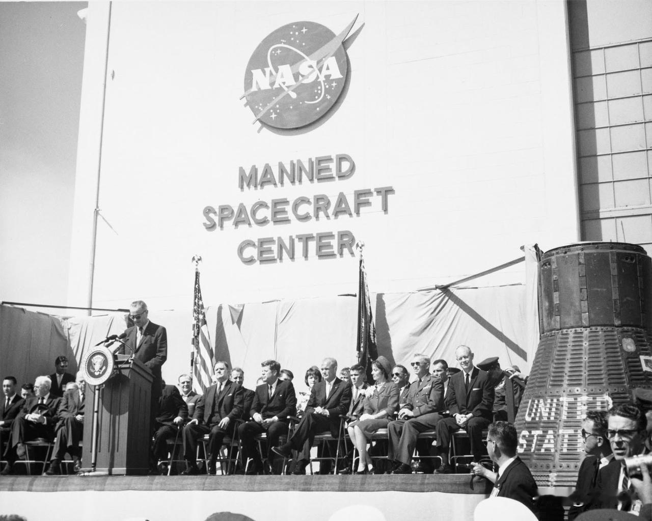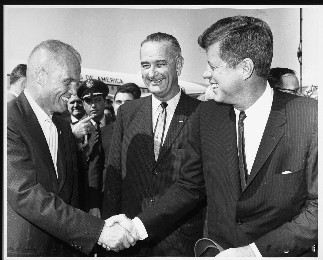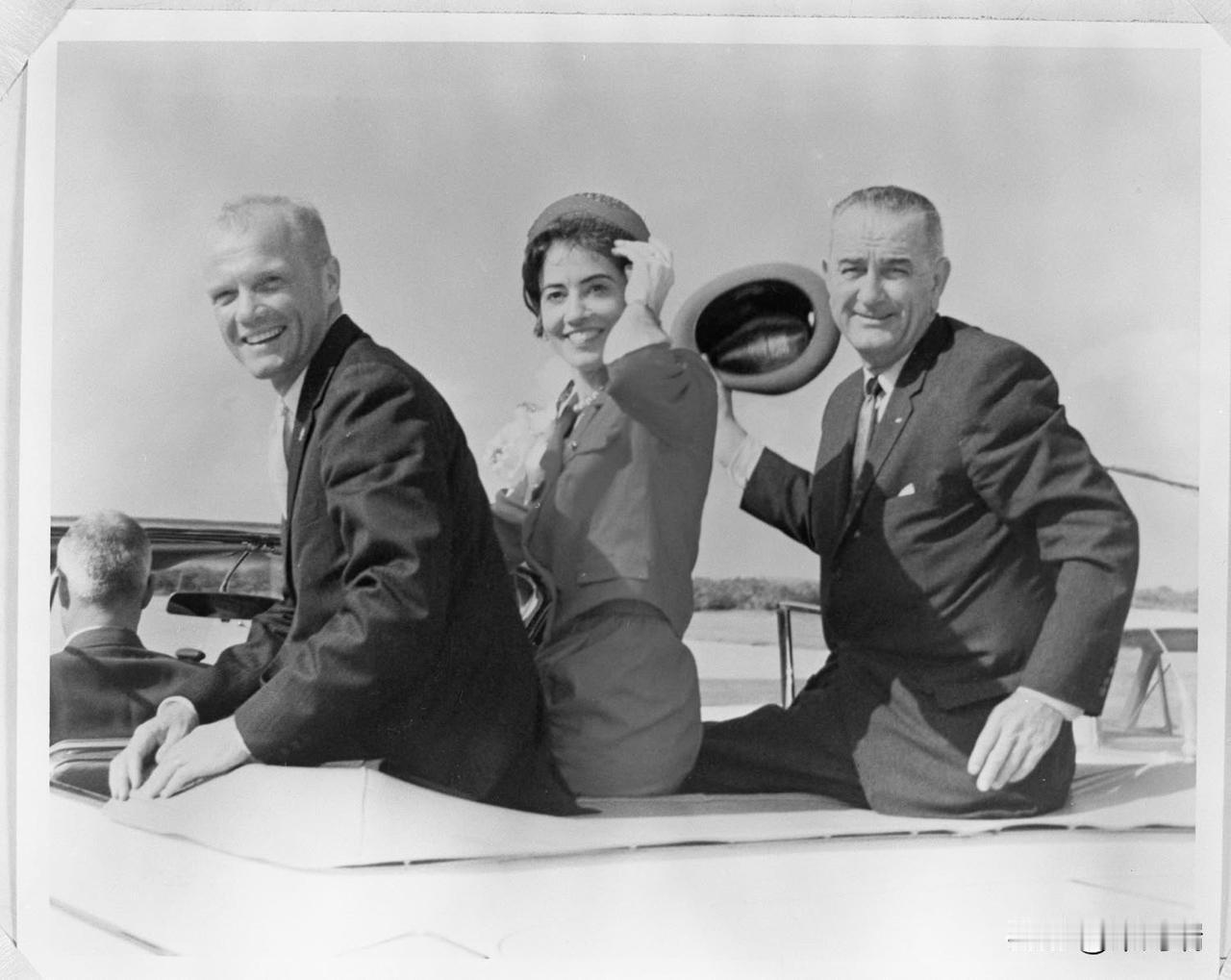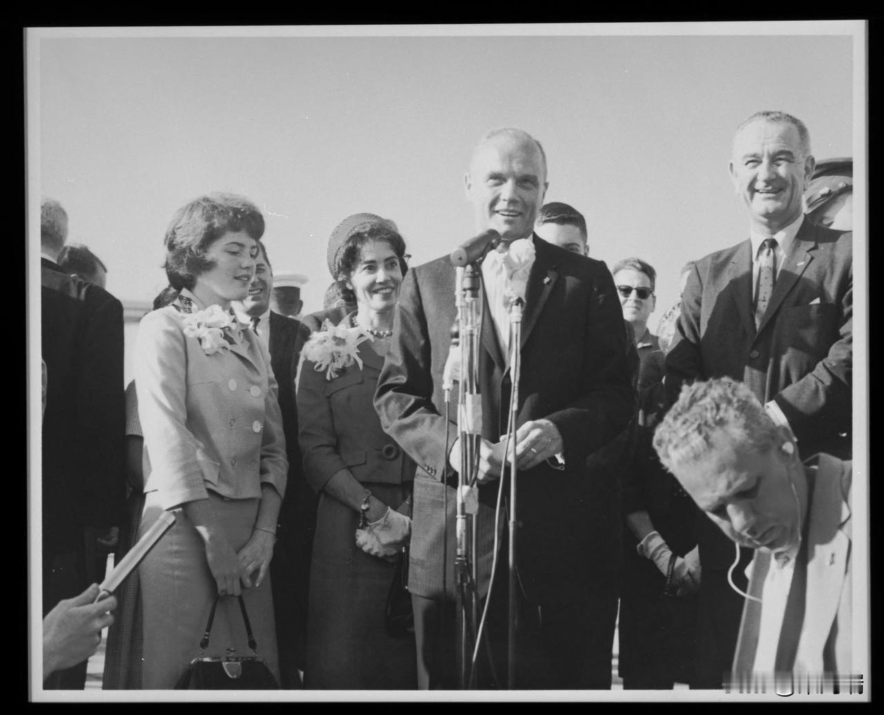 1962年2月23日,肯尼迪总统和约翰逊副总统在佛罗里达州卡纳维拉尔角向宇航员约翰·格伦颁发了美国国家航空航天局(NASA)杰出服务奖。三天前,格伦乘坐水星-阿特拉斯6号“友谊7号”飞船完成了美国首次载人地球轨道飞行。