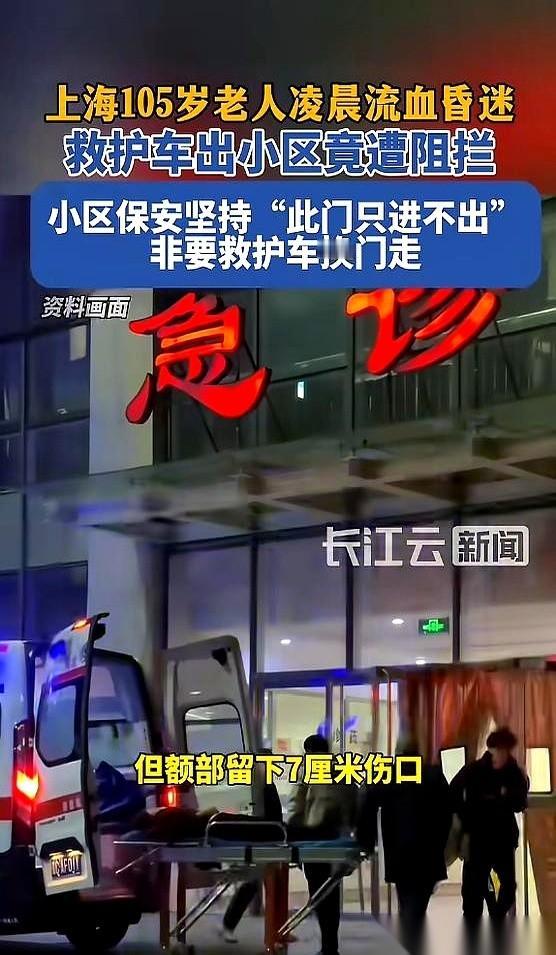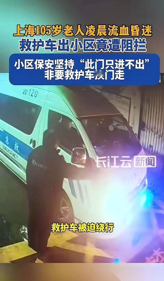 我跟你讲,有时候最让人后背发凉的,不是什么大事,就是一个小人物,握着一丁点儿权力,然后脑子死机了的样子。 上海,凌晨两点,下着雨。一辆救护车,顶灯转得跟催命符似的,里面躺着个105岁的老太太,刚摔倒,头上7厘米的口子,昏迷,流着血。 车开到小区东门,最近的路,结果被保安拦下了。 为啥? “规定,东门只进不出。” 就这几个字,一根塑料栏杆,把一条人命给堵死了五分钟。 整整五分钟啊。 急救医生在车里喊,家属在雨里都快跪下了,那个保安,就跟个设定好程序的机器人一样,不为所动。 我真的没法想象家属当时的心情。看着救护车那个红蓝的灯光打在保安那张无动于衷的脸上,雨水混着泪水,那是一种怎样的绝望? 最后没办法,救护车在窄路上,一点一点倒车,调头,绕远路。 事后物业怎么说? 更逗了。说下雨天,遥控器受潮,失灵了。电脑也死机了。 你猜我信吗?记者去试了,好使得很。 退一万步讲,就算全坏了,那根杆子是金刚石做的?一个大活人,手动抬一下,或者干脆掰了它,不就是几秒钟的事? 说白了,坏的不是遥控器,是人心。 是那种“多一事不如少一事”、“万一担责任怎么办”的彻底冷漠。 幸好,老太太命大,抢救过来了。 但这件事,比悲剧本身更让人心寒。 它告诉你,有时候挡住生命通道的,不是天灾,而是一个恪守“规定”的傻子。