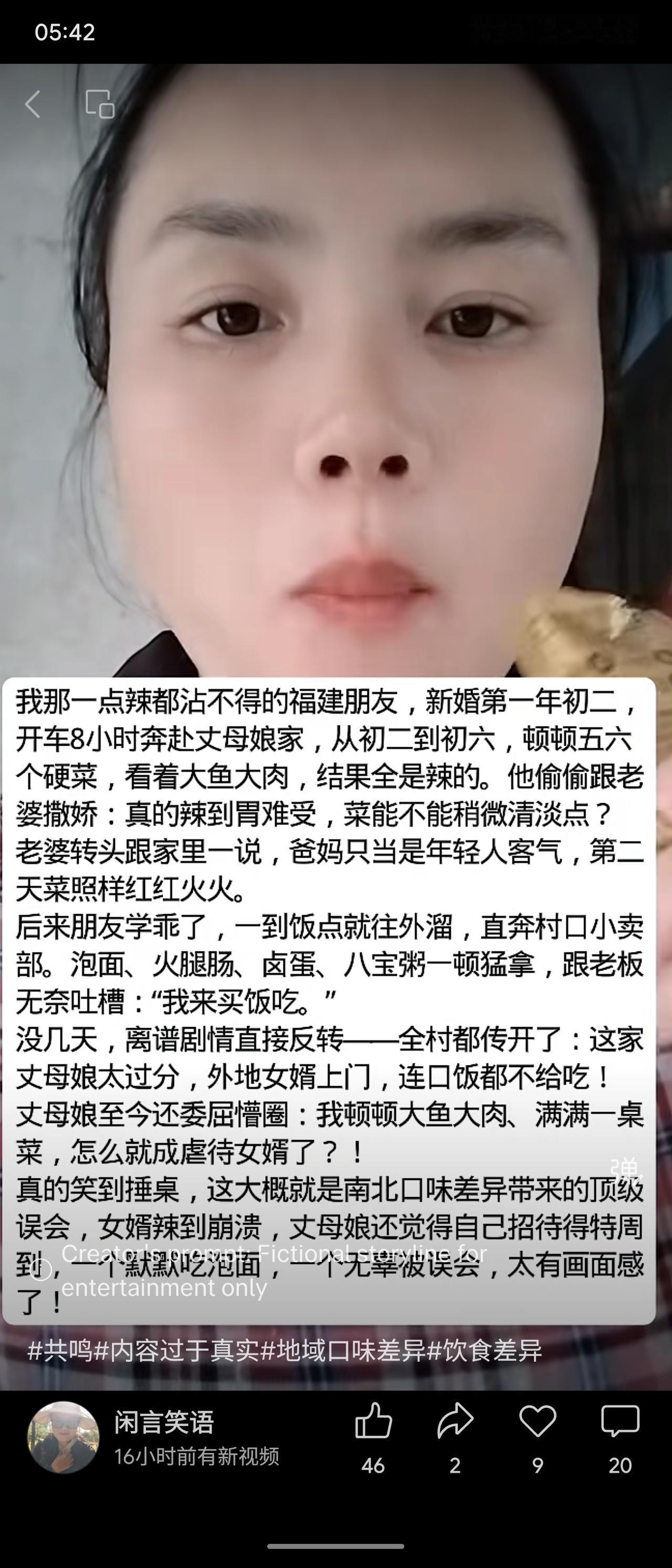 福建女婿到无辣不欢的丈母娘家过年,顿顿硬菜却辣到胃疼,只好偷溜去小卖部买泡面充饥。结果全村传言他被虐待,丈母娘委屈:大鱼大肉怎么就不给饭吃了?南北口味差异引发的顶级误会。