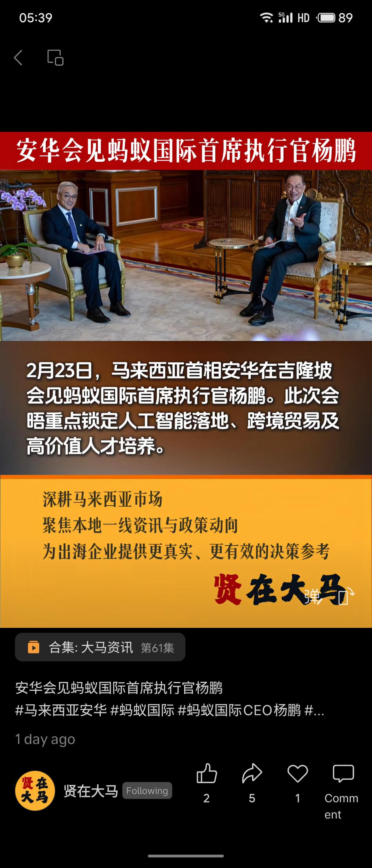 马来西亚首相安华会见蚂蚁国际CEO杨鹏,重点讨论人工智能落地、跨境贸易和高价值人才培养。蚂蚁国际在马来西亚有深厚背景——国家主权基金国库控股是其投资者和战略伙伴。安华明确欢迎蚂蚁扩展业务,以推动国家数码经济增长。此次会晤标志中马数字合作深化,利好蚂蚁东南亚布局。