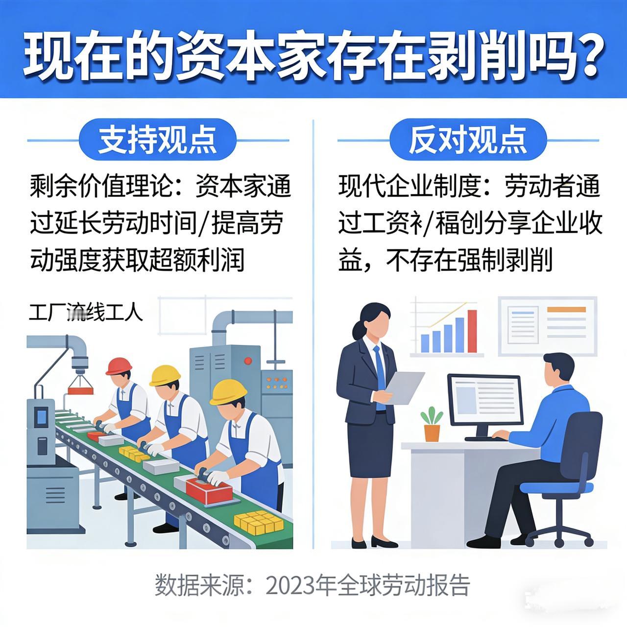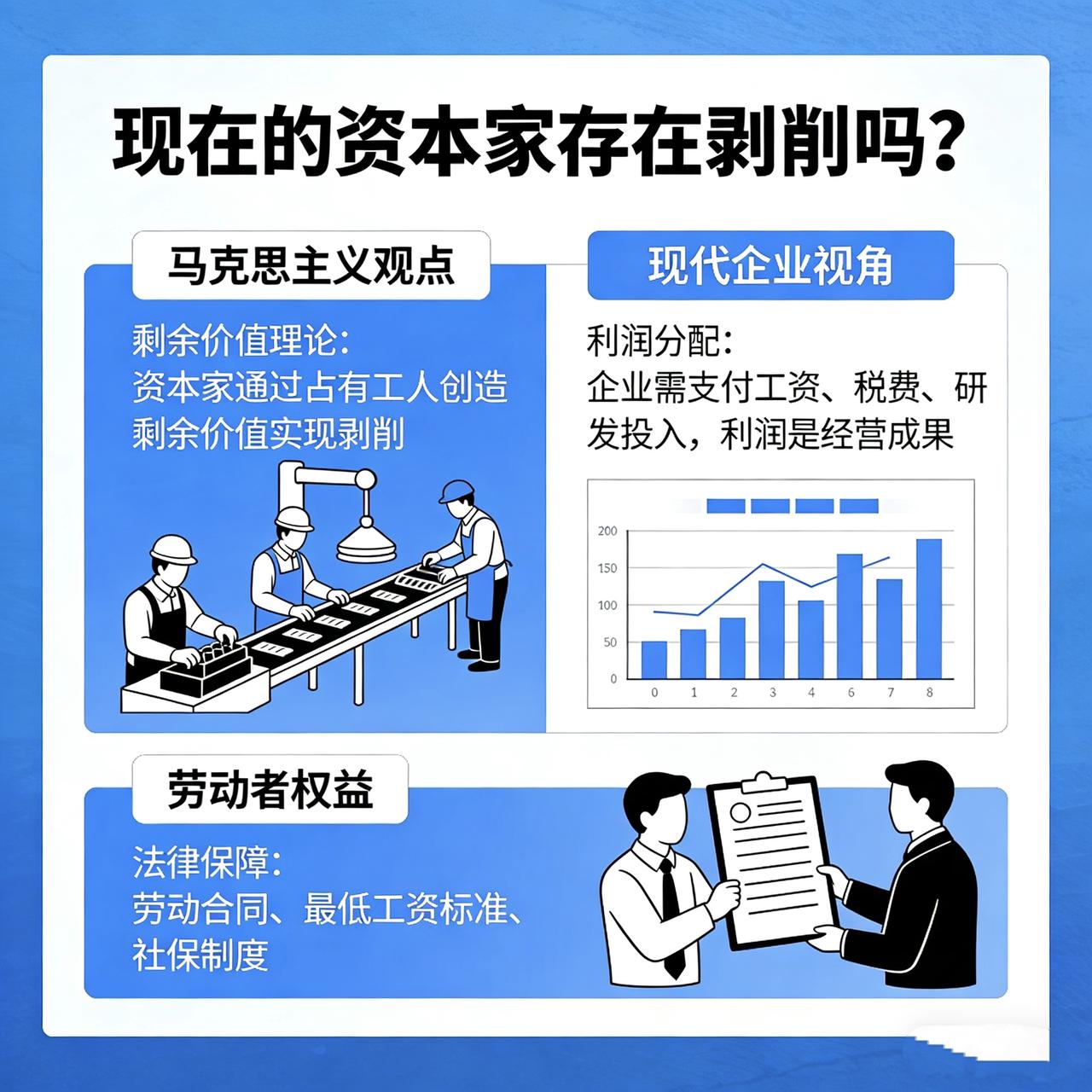 现在的资本家存在剥削吗?这是一个很深刻的问题。如果沿用马克思“剩余价值”的理论框架来看,当代社会仍然存在“剥削”的实质,但其表现形式已发生了根本性的变化。 它与解放前那种原始的、赤裸裸的压迫不同,今天的“剥削”更隐蔽、更复杂,主要体现在以下几个方面: ⚙️ 形式之变:从“身体压榨”到“算法规训” 解放前的剥削是直观的肉体折磨(超长工时、童工、 unsafe 环境)。而今天,资本更多是通过技术手段进行控制。 例如,在外卖、网约车等行业,平台通过算法对劳动者进行着“强控制”。系统精确计算配送时间、动态调整抽成比例,让骑手或司机在不知不觉中“自愿”提高劳动强度。据研究,网约车算法可使司机单位时间劳动强度提升30%以上,而平台抽成可达20%~30%。这种通过数据和规则实现的“软性”压榨,比过去的工头鞭子更有效率。 🌐 维度之变:从“体力剥削”到“数据剥削” 这是数字时代最显著的新特征。在解放前,剥削主要针对工人的体力劳动。而现在,资本同时剥削着两种劳动: 1. 雇佣劳动者的显性劳动:如外卖员的配送服务。 2. 所有用户的隐性“数字劳动”:你在电商平台的每一次浏览、在社交媒体的每一次点赞,都是在为平台无偿生产数据。这些数据经过算法加工,转化为精准广告等数据产品,创造出巨额价值,但作为数据的生产者,用户通常无法分享这部分收益。有学者用公式 M = \alpha K + \beta L + \gamma D 来描述这种新变化,其中 \gamma D 代表的数据价值正成为争夺的焦点。 ⚖️ 分配之变:从“绝对贫困”到“相对失衡” 解放前的剥削直接导致工人生存难以为继。今天,随着最低工资、社会保障等制度的完善,劳动者基本生存有了底线。问题更多地转向了分配的结构性失衡。 平台资本凭借对算法和数据的垄断,占据了绝大部分收益,而普通劳动者议价能力很弱,往往只能拿到维持基本生活的报酬。有研究指出,某些平台经济的剩余价值率(剥削率)远高于传统行业,这加剧了社会贫富分化。 🏛️ 最关键的不同:有形的“制度笼子” 与解放前资本几乎不受约束不同,今天的中国为资本划定了明确的红线和规则。 国家正通过一系列制度将资本运行纳入法治轨道: · 法律保障:出台《民营经济促进法》,强调“保障劳动者合法权益”。人社部等部门持续加强劳动保障监察,2024年全国劳动保障案件结案率达98%。 · 新业态治理:针对平台经济,推动算法透明化试点,并鼓励工会与平台就抽成规则、劳动安全等进行集体协商,预计覆盖超2000万新就业形态劳动者。 · 数据确权:针对数据剥削,一些地方开始探索数据产权“三权分置”,比如深圳尝试让数据提供者享有70%的收益权,从源头上保障用户分享数据价值的权利。 所以,我们可以这样来理解这个复杂的问题:“剥削”的现象在局部和新的形式上依然存在,但国家正通过不断完善的制度和法治,努力将其限制在合理范围内,并推动发展成果由劳动者共享。
