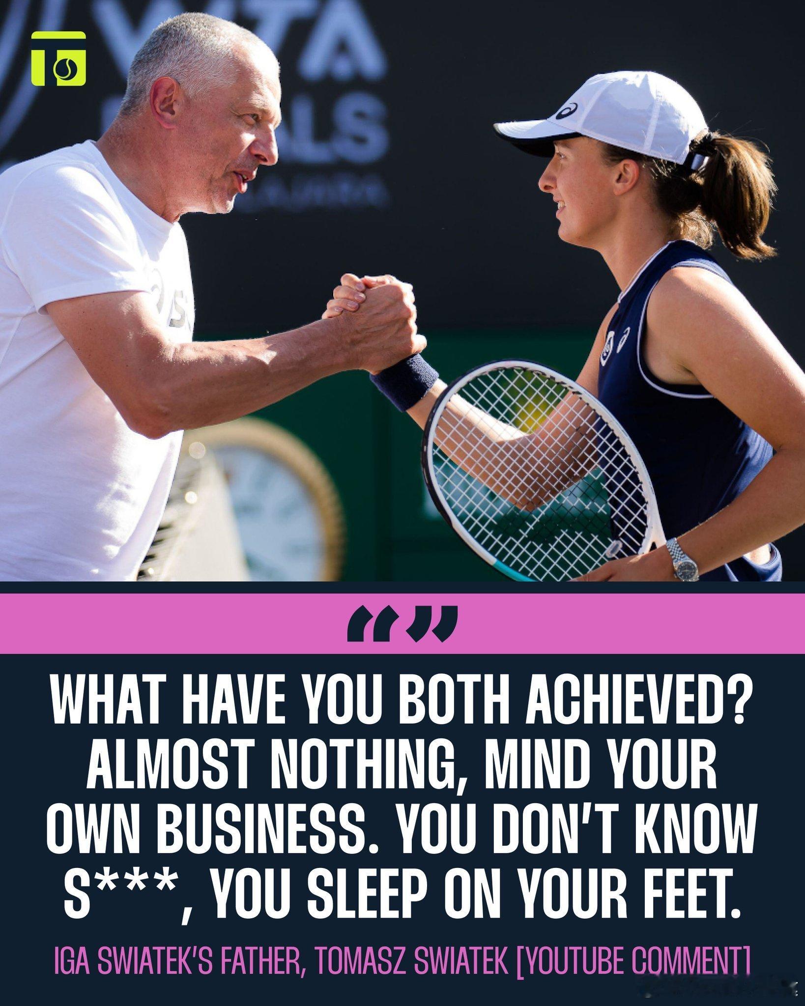 【斯瓦泰克和心理师走太近?】波兰主持人点名批评了斯瓦泰克与其心理师达莉亚·阿布拉莫维奇之间极度紧密的关系。“我不认识任何日夜与心理师相处的网球选手。他们一起度假、参加赛事…一起看电影。伊加非常依赖她。当然,如果这对她有好处,我没有意见。但人们必须明白,我可以表达我的看法,我只是说这让我有些惊讶。但如果这对一位世界排名第二、曾位居第一、并赢得六座大满贯的网球选手有益,我还能说什么?”“澳网和多哈,达莉亚·阿布拉莫维奇是否提供帮助并不明显,因为伊加非常紧张。她没有任何可以放松的技巧。因此,外界开始以不同的角度看待这种合作关系。”斯瓦泰克父亲:“你们两个有什么成就?几乎没有,管好你们自己的事。你们根本不知道发生了什么!”体育拜大年