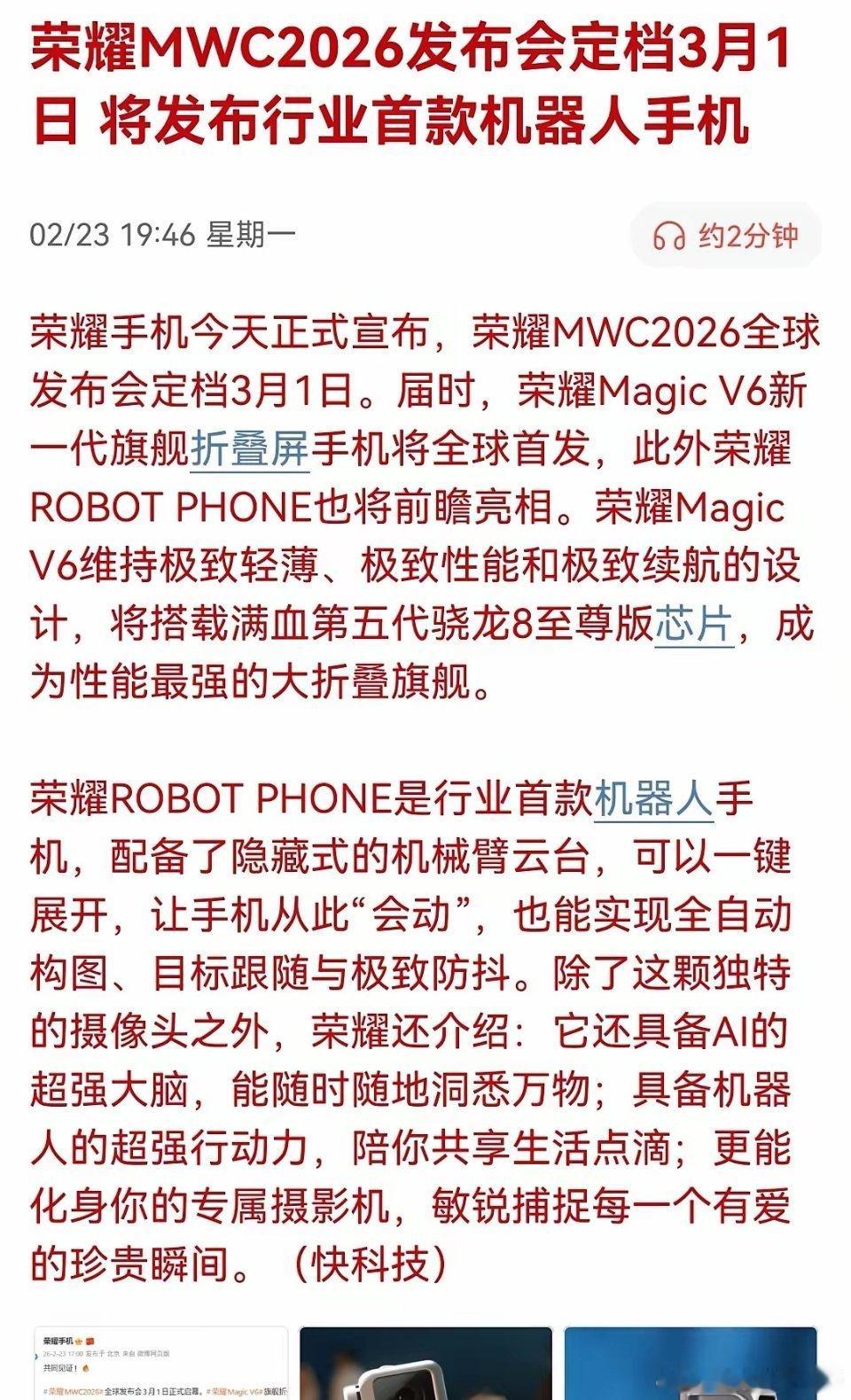 重磅!荣耀将发布行业首款机器人手机。中国科技真的太牛了,在科技应用方面真的是“打遍天下无敌手”!荣耀ROBOT PHONE将配备了隐藏式的机械臂云台,可以一键展开,让手机从此“会动”,也能实现全自动构图、目标跟随与极致防抖而且它还具备AI的超强大脑,能随时随地洞悉万物;具备机器人的超强行动力。这不是妥妥的小型智能机器人吗,难道机器人首先是从这种方式进入千家万户的吗?你们想买一部这样的手机吗,“小编”现在就想拥有了,不知价格如何!