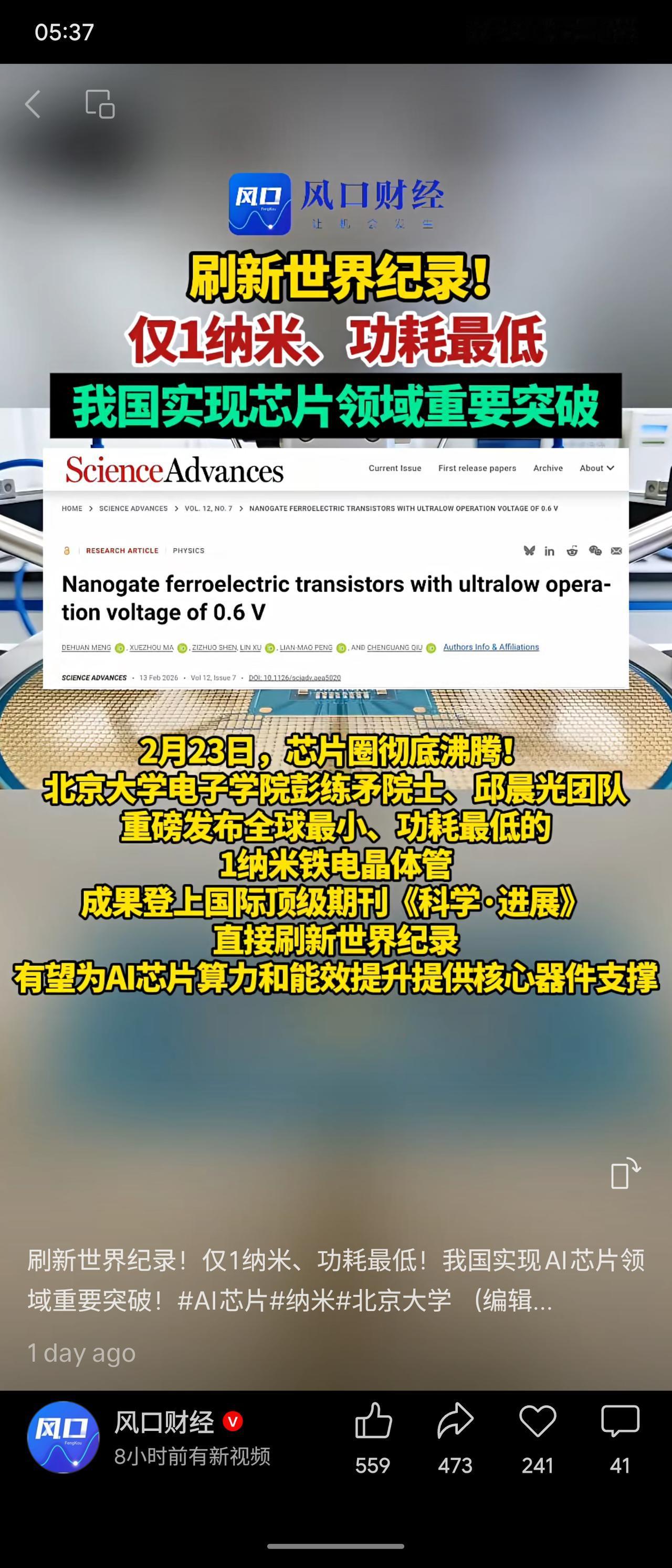 北京大学邱晨光团队在《科学·进展》发布突破:研制出全球最小(1纳米)、功耗最低的铁电晶体管,工作电压仅0.6V,能耗比现有技术低一个数量级。这项创新通过纳米栅极电场增强设计,突破芯片功耗与尺寸瓶颈,将为AI芯片、物联网、车载芯片等全产业链升级提供中国方案。