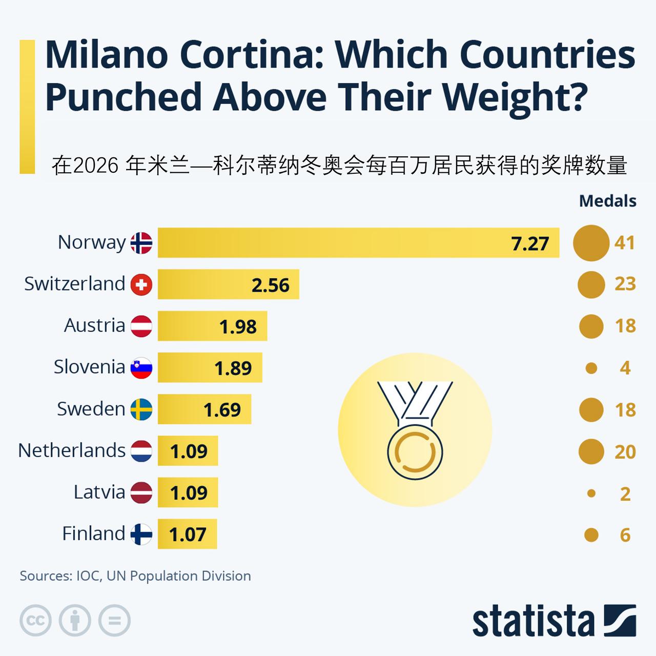 在米兰-科蒂纳冬奥会,哪些国家表现的最为出色? 如果按人口规模来比较各国在 2026 年米兰-科尔蒂纳冬奥会上的表现,哪些国家成绩最为出色呢?考虑到挪威人口稀少这一事实,该国在 2026 年冬季奥运会上取得的成就就更加令人瞩目了。这个斯堪的纳维亚国家仅有 560 万居民,却共获得了 41 枚奖牌,其中包括破记录的 18 枚金牌。这意味着每 100 万人口就能获得 7.27 枚奖牌——这是所有参赛国家中成功率最高的。 挪威之后依次是阿尔卑斯山地区的国家——瑞士、奥地利和斯洛文尼亚——这几个国家的人口规模都相对较小;还有瑞典、荷兰和拉脱维亚。美国人口将近 3.5 亿,在榜单上排名第 23 位,每百万人口获得的奖牌数为 0.09 枚。中国作为世界上人口第二多的国家,每百万居民获得的奖牌数仅为 0.01 枚。在人口超过 3000 万的国家中,加拿大排名最高,每百万人口获得 0.52 枚奖牌,略高于主办国意大利的 0.51 枚。