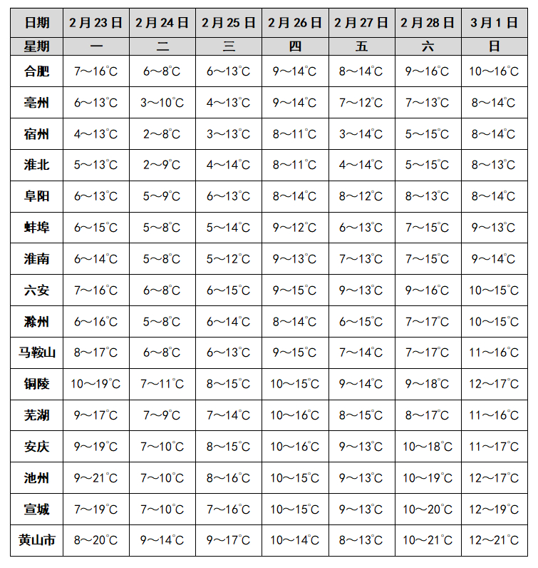 【#未来一周安徽全省多降水过程#】#今明两天安徽全省平均降温5到8℃# 据最新预报:未来一周安徽全省多降水过程。24日大别山区和沿江江南西部部分地区大雨;26日(初十)沿江江南部分地区中雨。受冷空气影响,今明两天全省平均气温自北向南将下降5~8℃,同时全省平均风力3~4级,阵风7级。冷空气过后25日(初九)早晨最低气温:淮北地区3~6℃,江南南部8~10℃,其他地区5~8℃。24日(初八)后全省大部分地区最高气温低于16℃。#开工大吉# 阴雨天开工 安徽最高气温10℃左右