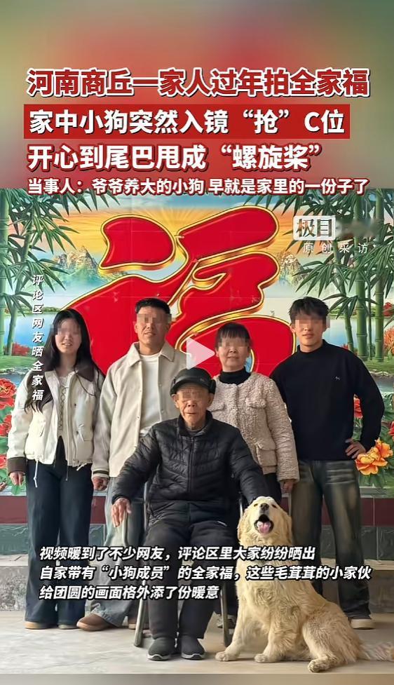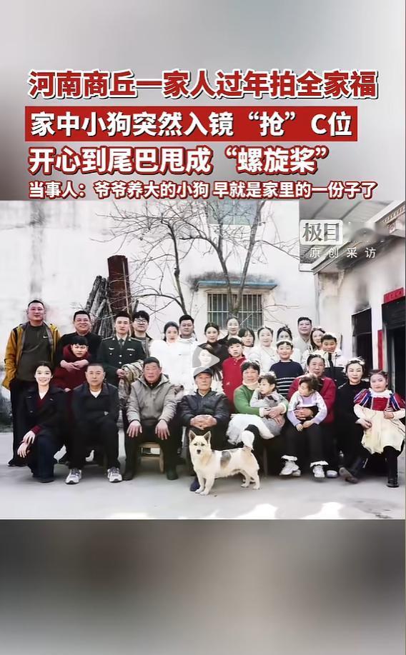 “主角总是最后一个登场的!”近日,河南商丘,一家人在拍摄全家福的时候,爷爷养的小狗在镜头前慢慢悠悠转过,尾巴欢快的摇着,跟“螺旋桨”一样。等小狗坐下后,摄像机倒计时正好结束,小狗稳居C位。网友:这小狗太有灵性了! 不少人家里都会养些宠物,时间一长,就跟自己的家人一样,宠物也慢慢通人性,知道主人想要做什么。 据媒体2月23日报道,徐女士一家每年都有拍全家福的习惯。今年拍全家福时,刚给摄像机设计好倒计时,爷爷养的小狗就慢慢从摄像机前面走了过去,慢慢悠悠的站到爷爷的面前,临了还扭头看了一眼摄像机。 这时候,摄像机倒计时正好结束。等徐女士打开照片一看,小狗正好在全家人的C位上,眼睛正视前方,拍的效果好极了!就跟他是主角一样! “估计是听到了妹妹喊倒计时的声音,小狗自己就蹲到了爷爷前面,当时尾巴摇的可欢了”,徐女士这样说到。“平时都是小狗在家里陪着爷爷,跟我们也很亲近,我们早就把它当成这个家的一份子了。” 网友看后表示,毛孩子最能治愈人心了。每当自己孤独的时候,都是这些毛茸茸的小家伙陪着自己,真的是跟自己的家人一样。以后自己也要多和毛孩子拍照,记录下这些温馨的时刻。 信息来源:《河南商丘一家人过年拍全家福,家中小狗突然入镜“抢”C位,开心到尾巴甩成“螺旋桨”,当事人:爷爷养大的小狗,早就是家里的一份子了(素材来源:@贝多芳 )》极目新闻