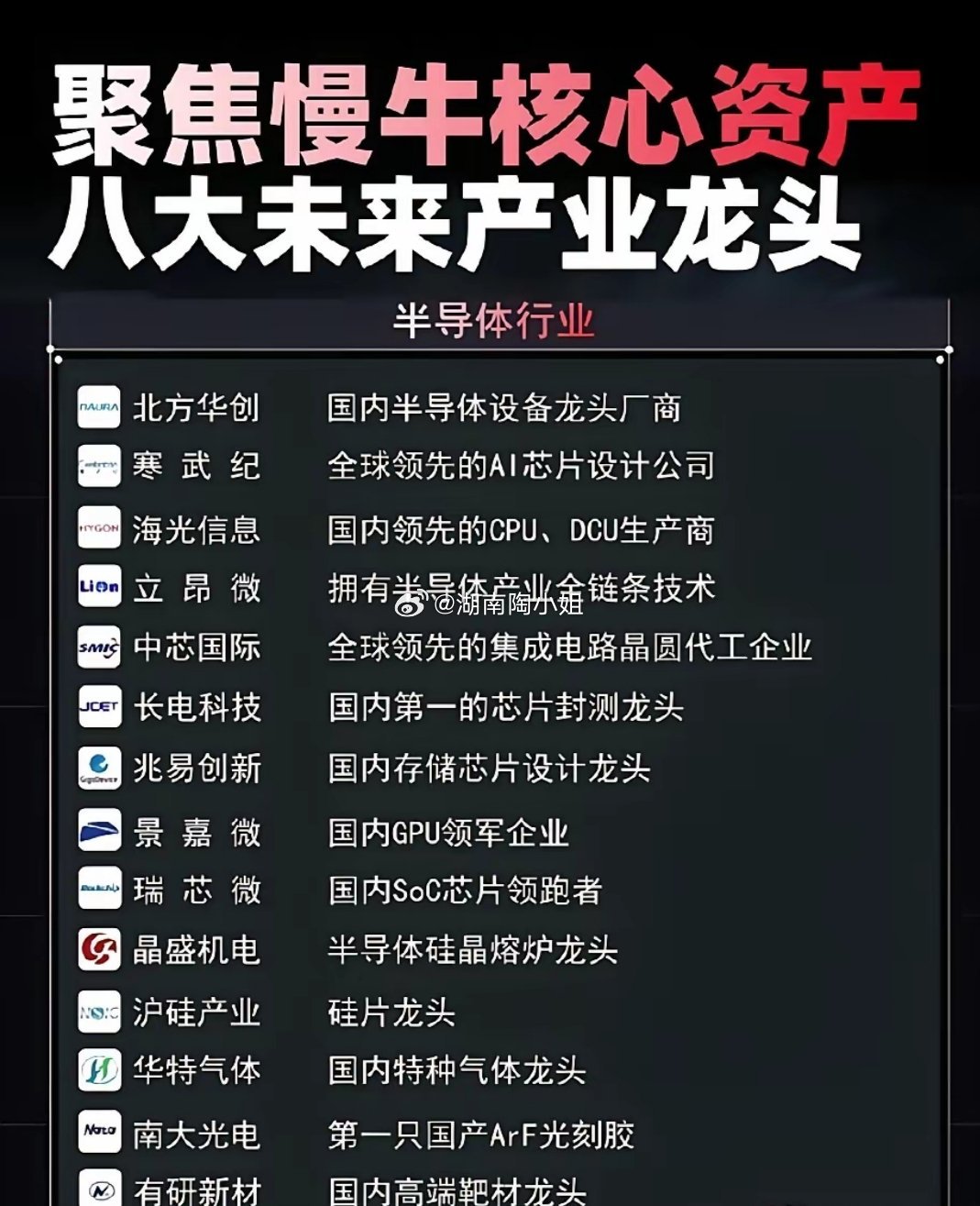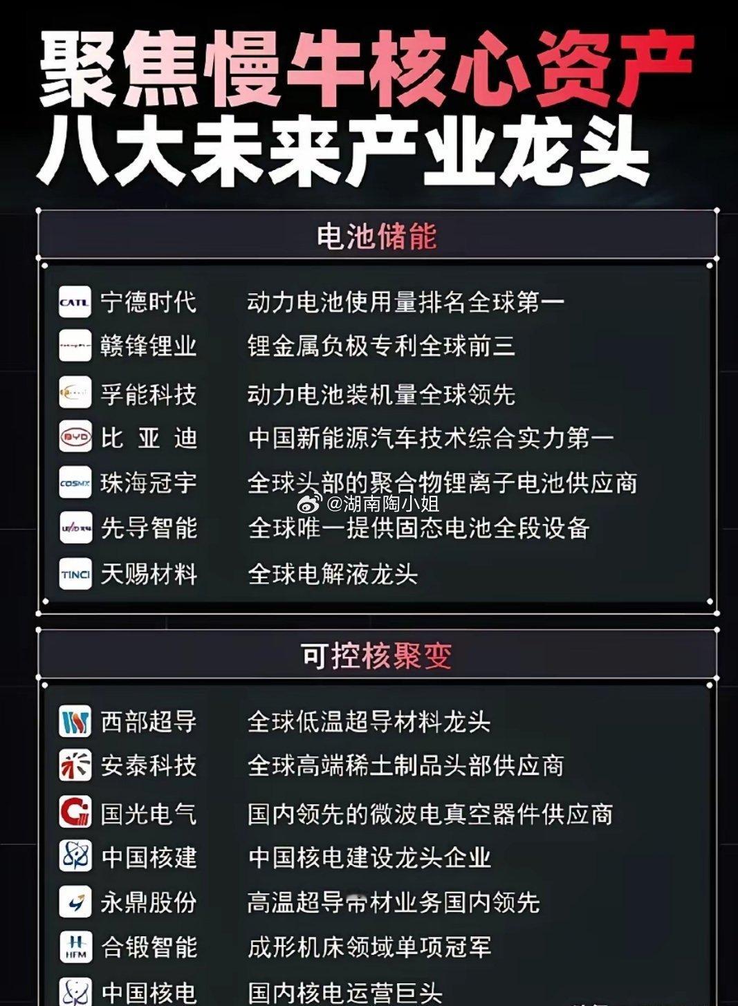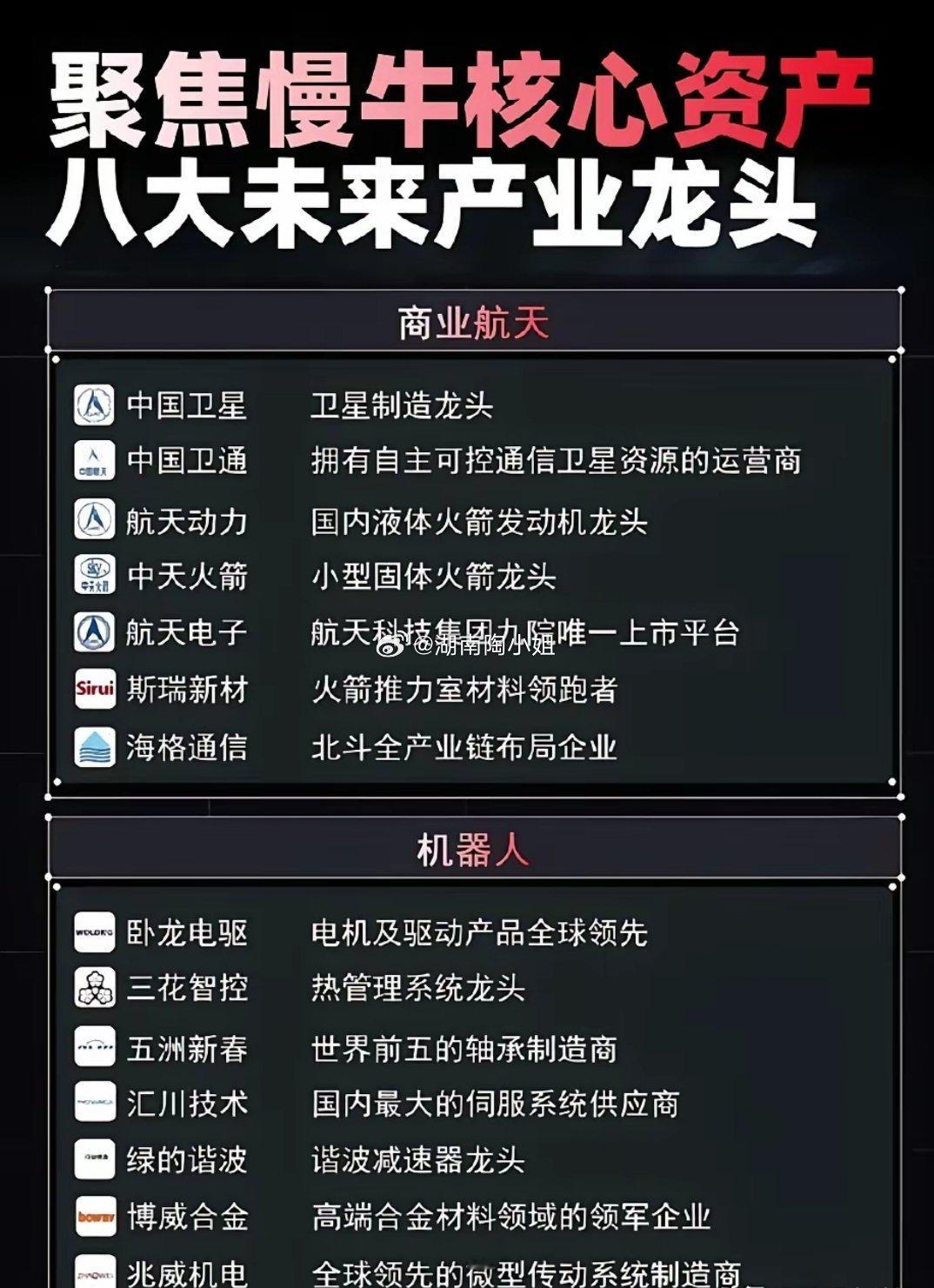 锁定慢牛核心资产,八大未来产业龙头全梳理!A股慢牛行情已启,未来产业主线清晰!半导体、商业航天、机器人、电池储能、可控核聚变、消费电子、算力、量子科技八大黄金赛道,龙头企业名单已整理完毕,每一家都是细分领域的绝对王者,是把握时代红利的关键抓手!相关概念龙头代表有哪些?半导体概念:国产替代加速,全产业链龙头领航。半导体是科技自立自强的核心赛道,国产替代浪潮下,概念核心龙头值得关注:寒武纪、南大光电……商业航天概念:大国重器新赛道,卫星+火箭双轮驱动是未来十年最具爆发力的科技赛道之一。行业龙头代表有航天电子、中国卫通……⚠️ 注:文中内容不构成具体投资建议,仅供参考。投资者应自主做出决策并自行承担投资风险。投资有风险,入市需谨慎。