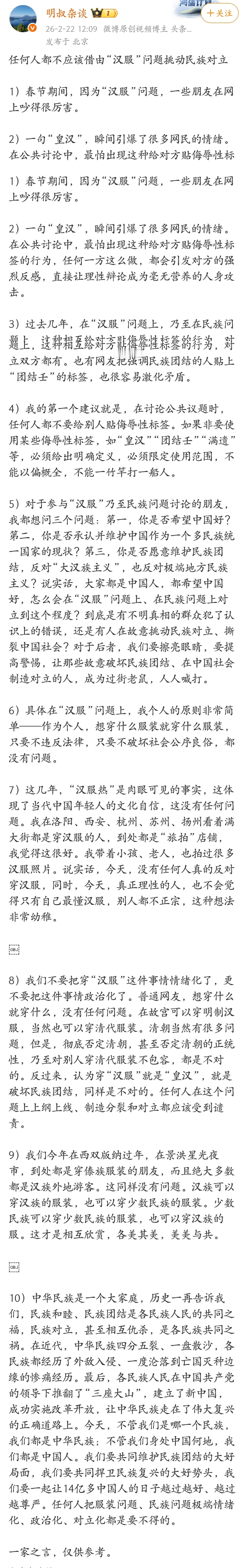 任何人都不应该借由“汉服”问题挑动民族对立。