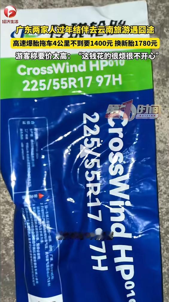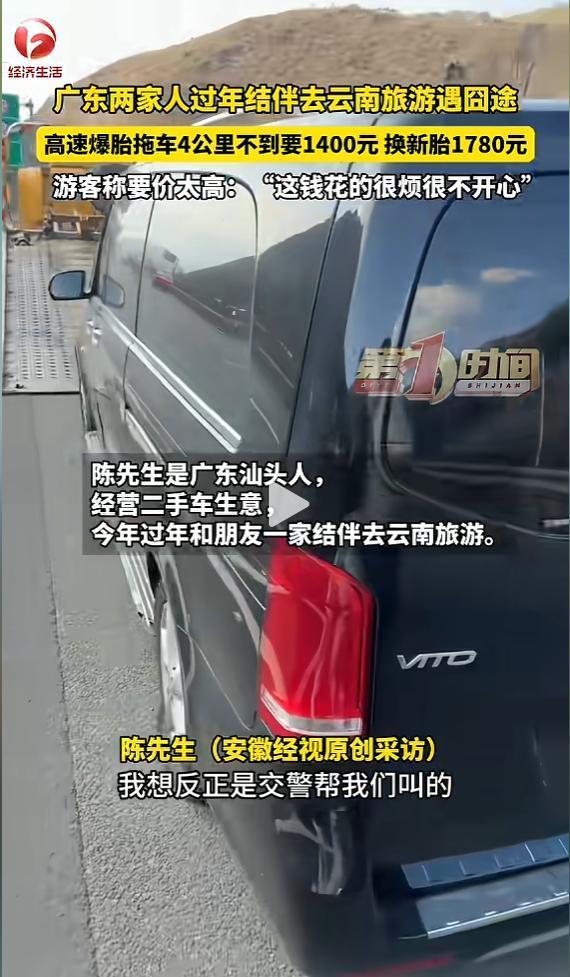 “没有成本全是利润!”近日,云南大理,一男子和朋友结伴出游时,车辆在高速路上不慎爆胎。交警给叫了一个拖车,谁知3.4公里的路程竟然要收费1400元。这还不算完,换个胎居然还要1780元!男子很是气愤,却又无可奈何。网友:想赚钱想疯了吧! 据媒体2月22日报道,陈先生是广东汕头人,经营二手车生意。今年春节,他和朋友一起结伴去旅游,谁知在大理遭遇了囧途。 当时,陈先生开的车在高速公路上爆了胎。比较幸运的是,不远处就有执勤的交警,就拜托交警给叫了一辆拖车,拖车在3.4公里外的一个收费站出了高速,把他们放了下来。 就这不到四公里的路程,拖车竟开口收费1500元,讲了讲价,最后付了1400元,这让陈先生很是气愤。不过,让陈先生更气愤的还在后面。 下来高速后,陈先生本来想自己补胎的,结果千斤顶坏了,不得已只能在网上找了家平台修车。对方告诉他,这个胎修不了,百分百要换新的,新胎1780元。就问他换不换。 陈先生表示,这个胎自己平时买一个也就三百块钱,对方居然如此狮子大开口。但碍于自己人生对不熟的,也没法自己换,不得已还是付了钱。一想到这,陈先生就觉得很闹心,“这钱花的很烦很不开心”。 网友看后表示,就算是过年人少,也不能这么贵吧,难不成咱用的不是一个货币?这么宰客,以后谁还敢上那儿去玩?就该找市监局治治他们! 信息来源:《高速拖车4公里不到1400元,换一个新胎1780元,广东两家人过年去云南旅游遇囧途。“这钱花的很烦很不开心”》AHTV第一时间