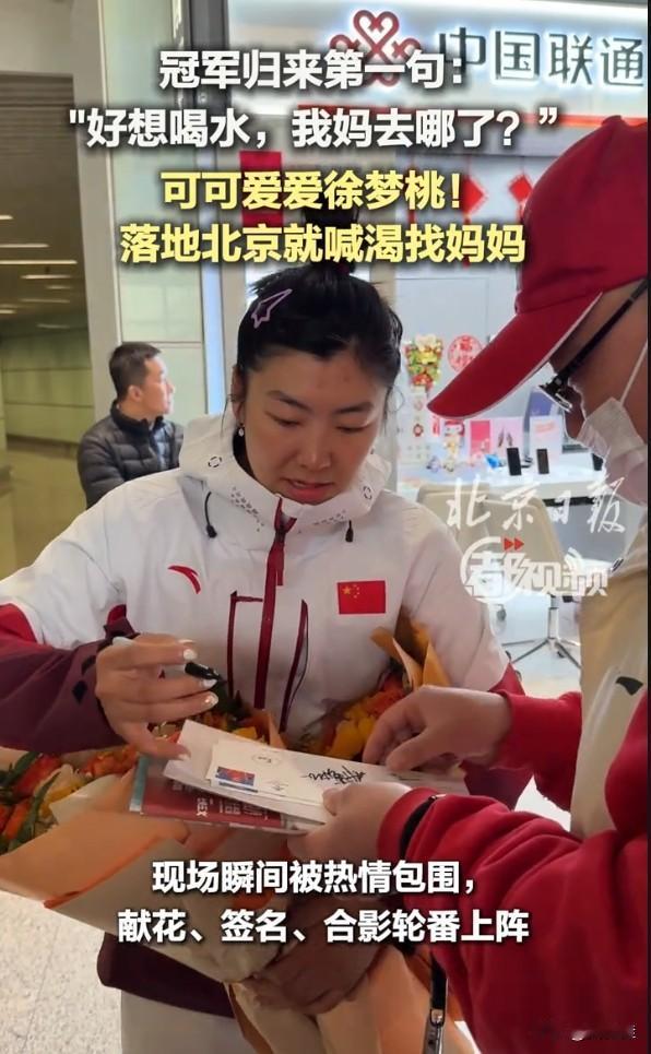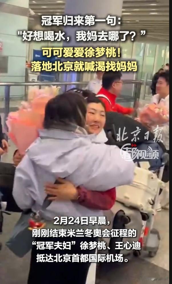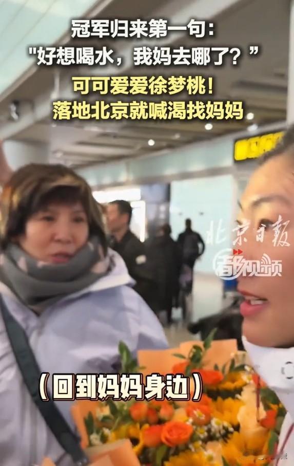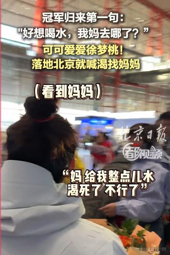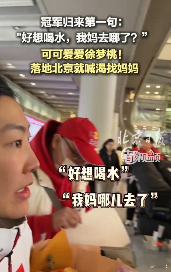 徐梦桃也太可爱了!刚下飞机就到处找妈妈,嘴里还念叨着:“好想喝水,我妈哪去了?”