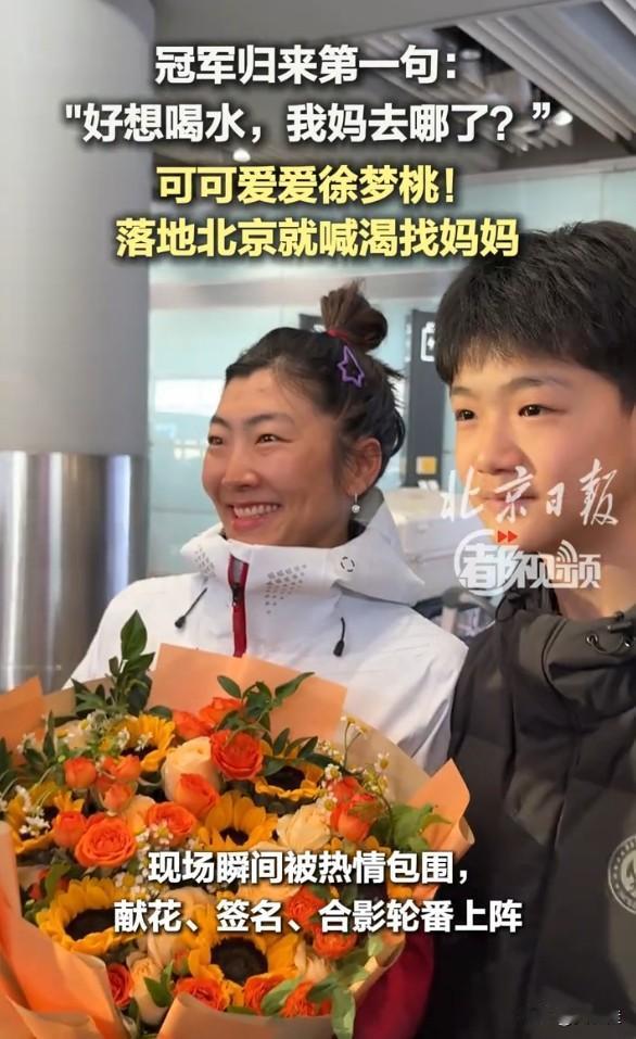 徐梦桃也太可爱了!刚下飞机就到处找妈妈,嘴里还念叨着:“好想喝水,我妈哪去了?”一见到妈妈,立刻撒娇:“妈,给我整点水水喝,渴死了。”不管拿过多少金牌,在妈妈面前,奥运冠军也只是个需要被照顾的孩子。 徐梦桃和丈夫刚落地,就被热情的粉丝和人群团团围住。即便刚经历长途飞行,她也没有半点不耐烦,始终笑着配合大家拍照、签名,态度温柔又真诚。来者不拒,认真对待每一个人,一点冠军架子都没有。 赛场上她是敢拼敢闯的勇士,生活里她是孝顺懂事的女儿,待人谦逊有礼、温柔接地气,这样真实又可爱的徐梦桃,真的让人越看越喜欢。