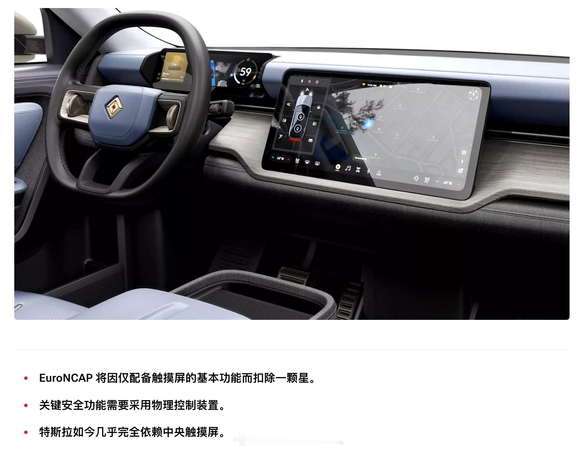 在不带机械解锁的隐藏式门把手这个设计被否定以后,纯大屏幕的设计也从安全设计方面在被否定。Euro NCAP 出台新规:汽车转向灯、雨刮、双闪、喇叭、SOS等关键安全功能,必须配备实体物理按键,不能只靠触摸屏操作。达不到要求的车型,安全评级直接扣一颗星,且无申诉空间。