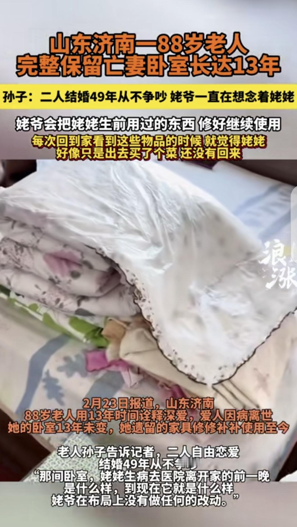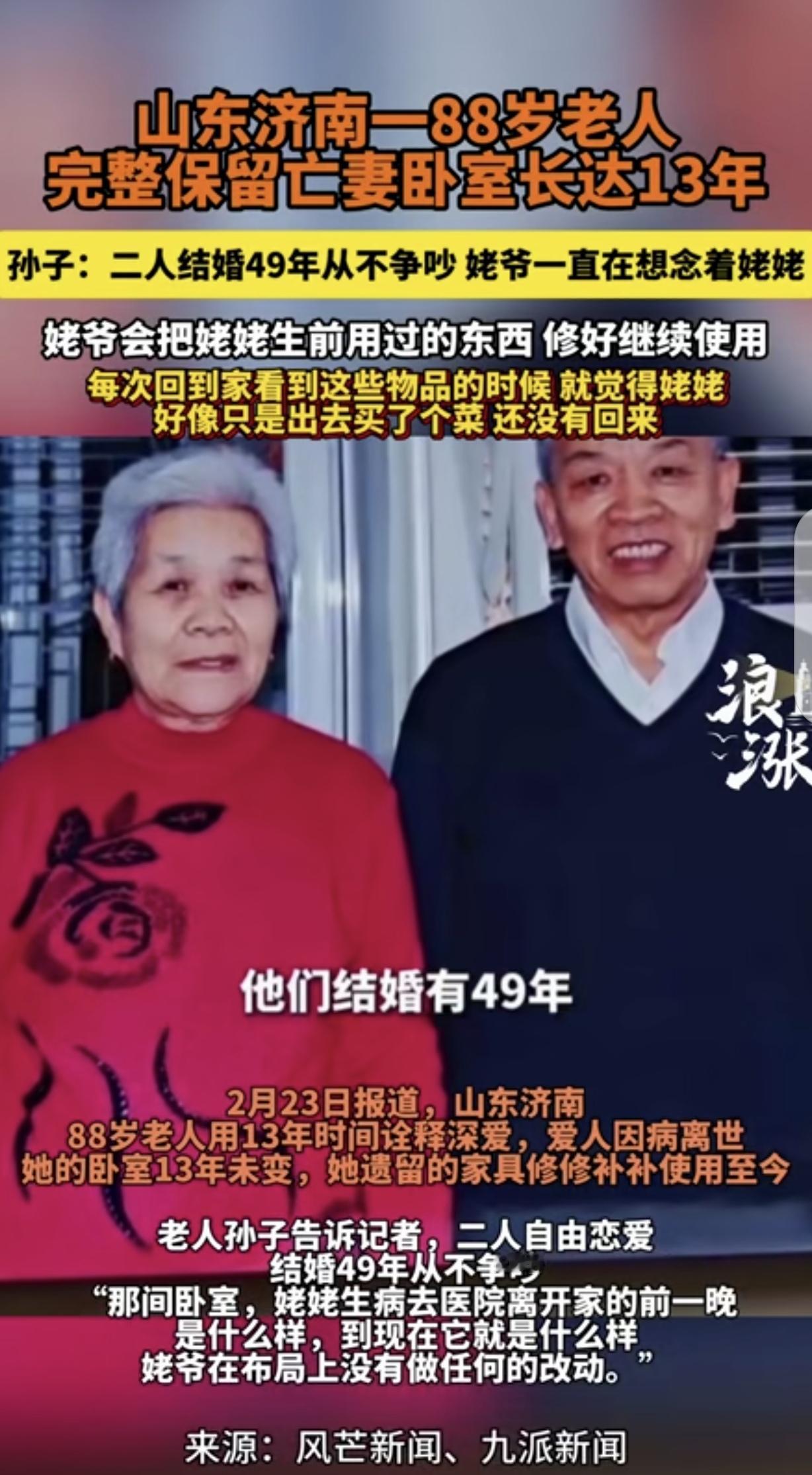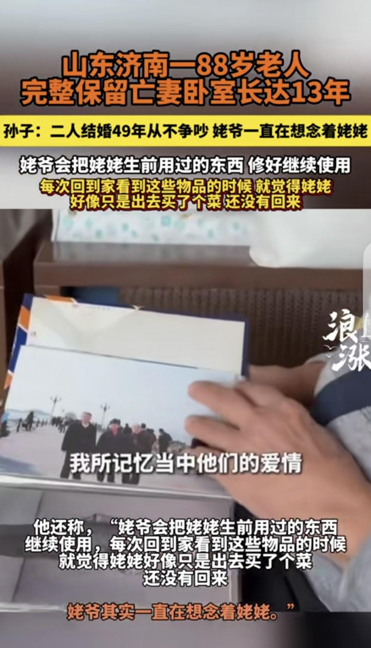 “这么深情的男人太少了!”山东济南,一88岁老人跟老伴自由恋爱,结婚49年没红过脸,老伴病逝13年,他没再婚,把她的卧室保持原样,老伴用过的东西,他修好继续用,外孙子每次去看老人,就感觉外婆好像只是出去买菜还没回来。老人一直在思念老伴。 一位88岁的老人,和老伴是自由恋爱走到一起的。 在那个年代,自由恋爱可不像现在这么普遍,他们冲破了传统的束缚,凭借着彼此的真心和勇气,携手步入了婚姻的殿堂。 这一牵手,就是49年。在这49年里,他们几乎没有红过脸,更别提争吵了。 生活中的点点滴滴,鸡毛蒜皮,都被他们经营得温馨又和谐。 然而,深情不寿。13年前,老伴生病离世,这如同一道晴天霹雳,打破了原本平静又幸福的生活。 从那以后,老人就像变了一个人,但这份变化里,藏着对老伴的思念和深情。 老伴走后,老人没有再婚。他把老伴曾经住过的卧室,保持得和老伴离开前一晚一模一样。 卧室里的布置,没有丝毫的改动。那张老伴睡过的床,床单还是原来的款式,虽然有些旧了,但老人舍不得换,因为那上面似乎还残留着老伴的气息。 床头柜上,摆着老伴常用的台灯,灯光依旧温暖,就像老伴还在身边一样。 衣柜里,老伴的衣服整齐地挂着,老人偶尔会打开衣柜,轻轻抚摸那些衣服,就像在和老伴说话。 老伴用过的很多东西,坏了之后,老人都会自己动手修好,然后接着用。 一把用了多年的梳子,梳齿断了,老人用胶水小心翼翼地粘好;一个老伴喜欢的茶杯,杯柄裂了,老人找来工具,一点点地修补。 这些物品,在老人眼里,不仅仅是物件,上面还残余着老伴的温度,让他睹物思人。 老人的外孙子每次去看望他,一走进那间卧室,就会产生一种错觉,感觉外婆好像只是出去买菜还没回来。 13年,5000多个日夜,老人就这样默默地思念着老伴。 他用自己独特的方式,守护着这份爱情,守护着和老伴一起度过的那些美好时光。 在这个快节奏的时代,这样深情又专一的男人,真的太少了。 老人的故事,证明真正的爱情,是可以跨越生死,永恒不变的。 在如今这个感情似乎变得“速食”的时代,老人用13年的坚守,诠释了爱情最本真的模样。 他与老伴自由恋爱,49年不吵不闹,这份相濡以沫的深情本就难能可贵。 老伴离世后,他不改卧室布局、修好旧物继续用,每一个举动都饱含着对老伴深深的思念。 他没有被孤独打倒,也没有因岁月流逝而淡忘爱人,而是把这份爱藏在生活的细节里。 这样的深情专一,就像一股清泉,让我们看到了爱情最纯粹、最美好的一面,也让我们反思,在追求物质的当下,是否忽略了爱情的真谛。 《民法典》第1043条规定,家庭应当树立优良家风,弘扬家庭美德,重视家庭文明建设。夫妻应当互相忠实,互相尊重,互相关爱。 88岁老人与老伴结婚49年几乎不红脸,老伴离世后仍深情守望,将卧室保持原样、修好旧物继续用。 这是对老伴的忠实、尊重与关爱,体现了夫妻间深厚的情感,也践行了家庭美德,符合法律所倡导的家庭文明建设理念,为构建和谐家庭关系树立了榜样。 对此,你怎么看?