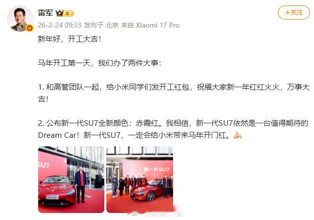 【雷军给小米同学们发开工红包雷军公布新SU7全新颜色】 发文称:新年好,开工大吉!