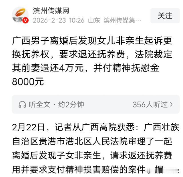 广西,一女子跟丈夫结婚之后生下大女儿,之后女子就搞花头在外面有人了,甚至还发生了不该进行的事情。没多久女子再次怀孕,又生下了小女儿,不过妻子知道这个孩子是外面那个男人的,还一直瞒着丈夫让他成为“背锅侠”。再后来因为生活琐事夫妻二人离婚,大女儿跟着妻子,小女儿跟着丈夫,丈夫发现小女儿长得不像自己,去做了鉴定,结果显示:排除生物学父亲可能。 这个结果让男子感觉五雷轰顶,养了10年的小女儿,竟然不是自己亲生的!(本新闻参考来源:滨州传媒网报道) 回想起多年前,张先生遇到自己的爱人杨某,两个人情投意合,之后直接就步入了婚姻的殿堂。 没过多久,妻子杨某就生下了一个可爱的大女儿,面对孩子的出生,张先生也是更加勤勉工作,给家庭多多挣钱,养活妻子、小孩。 可是妻子杨某却开始不安分了,女儿还没多大呢,她就开始有外心了,之后一直在外面跟其他男子混着。 甚至,两个人还发生了不应该进行的关系。当时两个人也没有采取措施,这一次分别后,没过多久,杨某就怀孕了。 而妻子杨某自己内心也清楚,这个孩子,并不是丈夫的。但是她又不敢声张,只能将错就错,甚至还说,这个孩子就是张先生的。 如此,张先生就变成“绿色”的父亲,还要帮助别人抚养小孩。 两个女儿,家庭担子就更加重了,可是,前后没几年,生活中不断有摩擦、不断激发小矛盾。 就在小女儿10岁大的时候,张先生跟妻子杨某的感情问题终于爆发,两个人去领取了离婚证。 判定离婚之后,大女儿判给了妻子杨某,小女儿则判给了张先生。自此,小女儿一直跟着爸爸生活。 其实,邻居早就有流言蜚语,说小女儿根本就不是张先生的,长得也不像。 张先生也一直在观察小女儿的长相,确实这个孩子跟自己长得不太像。张先生感觉,这件事不能再拖了,还是去做个鉴定吧。 等到张先生去做完鉴定,拿到检测报告的时候,张先生多年的猜测,也终于有了个结论。报告上写着:排除生物父亲可能。 这个结果证明,小女儿确实不是张先生的小孩。 张先生非常痛苦,要知道小女儿,他是真的含辛茹苦、一把屎一把尿的带大的,抚养了这么多年,肯定是存在感情的。 但是出于男人的自尊,张先生还是准备一纸诉状,准备找前妻杨某理论一番。要求变更女儿的抚养权,并且要求前妻杨某退还抚养费。 相关部门是怎么判定的呢? 经过工作人员的审理,发现杨某违背公序良俗,人品、道德都存在问题,已经侵犯了张先生的合法权益。最后给出的判定如下: 1.小女儿由女子杨某抚养; 2.判定杨某需要返还40000元的抚养费给到张先生; 3.杨某还需要额外赔偿8000元的精神损害抚慰金。 要说8000元的精神损失费,张先生这么多年来一直倾心相对,多年的感情最后却落空,尊严也被踩在脚下,哪里是这点钱可以抹平的呢? 本案释法: 女子跟丈夫结婚后,跟其他男人好上了,怀孕后还说孩子就是丈夫的,让丈夫给她抚养小孩长达10年。离婚之后,男子是否可以主张各项赔偿? 根据《民典法》规定,夫妻之间互相忠实,非婚生子女的父母才负有法定的抚养义务,如果是非生物医学父母,在法律上不形成抚养义务。 男子在不知情的情况下,面对妻子的情感背叛,给妻子以及外面的男人抚养了多年的非亲生子女,属于被欺诈性抚养。 面对妻子严重违反了婚姻忠实义务、违背了公序良俗,这位男子可以合法追回自己的权益,包括要求返还已经支付的抚养费、还可以主张精神损害赔偿费。 可是,最大的受害者,不是孩子吗? 本来孩子拥有家庭,有爸爸妈妈,但是疼爱自己的爸爸,最后却成为了陌生人,这让孩子怎么接受呢? 说到底,还是生母杨某太自私,根本就不配做妈妈,这样的人,也只能让法律来介入惩处。 “老实人就活该被欺负吗”?孩子就活该没有“爸爸”吗? 伴随着这样的阴影,不管是张先生,还是小女儿,都畏惧人与人之间的信任,以后还能相信谁呢? 对于此案,您作何感受呢?欢迎一起来讨论吧!