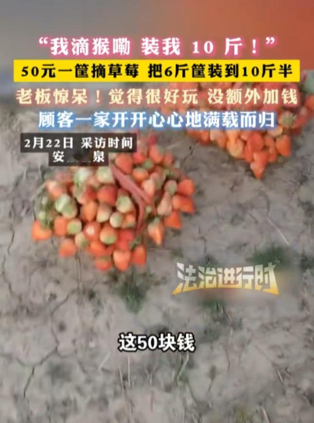 安徽临泉,一女子带着孩子们去摘草莓,老板说50元一篮子,万万没想到,女子竟在篮子中装了10斤草莓。在女子去结账时,老板都被惊呆了,这个篮子原本最多装6斤。 事发当天,一对夫妻带着三个孩子来到了其中一处采摘园。 春节期间,他们不想让孩子长时间对着电子屏幕,便计划用一场田园采摘丰富孩子的假期生活。 出发前,一家人就确定了分工,孩子负责采摘,父母负责装篮,目标是把 50 元的权益用到极致。 抵达园区后,夫妻二人先观察了其他游客的装篮方式,默默记下了能节省空间的技巧。 进入大棚,鲜红的草莓挂满枝头,孩子们立刻投入采摘,很快就收获了远超篮子容量的果实。 夫妻二人开始着手装篮,他们先效仿他人将草莓整齐摆放,腾出部分空间。 随后,他们商议后保留草莓根茎,将果实相互连接,再采用叠积木的方式逐层堆叠。 两人分工明确,一人摆放一人递拿,让草莓相互支撑,既保证稳固又避免挤压,最终在篮沿上堆出一座圆润的草莓塔。 装篮完成后,一家人发现篮子重得无法拎动,只能请老板过来查看。 老板看到这篮草莓时十分震惊,他从业多年,从未见过有人能把小篮子装到这种程度。 经过称重,这篮草莓的重量达到了 10 斤半,远超篮子 6 斤的常规容量,折合下来每斤草莓仅 5 元,老板已接近保本。 事实上,这既不是女子故意占便宜,也不是老板刻意设局,只是双方对 “一篮” 的定义存在认知偏差。 老板此前默认顾客会 “正常装篮”,没有明确告知重量上限,而夫妻二人则严格按照 “能装多少算多少” 的约定执行。 现场氛围始终轻松,一家人没有与工作人员产生分歧,孩子们看着自己采摘的草莓被妥善装好,充满了成就感。 老板在惊讶之余,也觉得这件事十分有趣,他坦言从未见过如此有 “天赋” 的装篮方式。 按照约定,夫妻二人只需支付 50 元。 尽管重量远超预期,老板还是遵守了承诺,没有提出额外收费的要求。 一家人高高兴兴地带着草莓离开,这场采摘也成了他们假期里一段有趣的回忆。 网友对此事看法不一,有人认为夫妻二人会过日子,也有人觉得这是钻了规则的漏洞。 从法律层面来看,双方已形成合同关系,老板的口头约定具有法律效力。 根据《消费者权益保护法》,经营者与消费者交易应遵循公平、诚实信用原则,老板既然做出了 50 元一篮的承诺,就无权单方面反悔。 这件事也给商家和消费者都提了个醒,面对按篮计费这类模式,提前沟通清楚容量、重量等细节,就能避免不必要的误会。 今天的分享到这里就结束了,大家对此事有何看法,欢迎在评论区留言和讨论,感兴趣的可以点击头像加关注,我将每日更新优质内容,我们下期见。