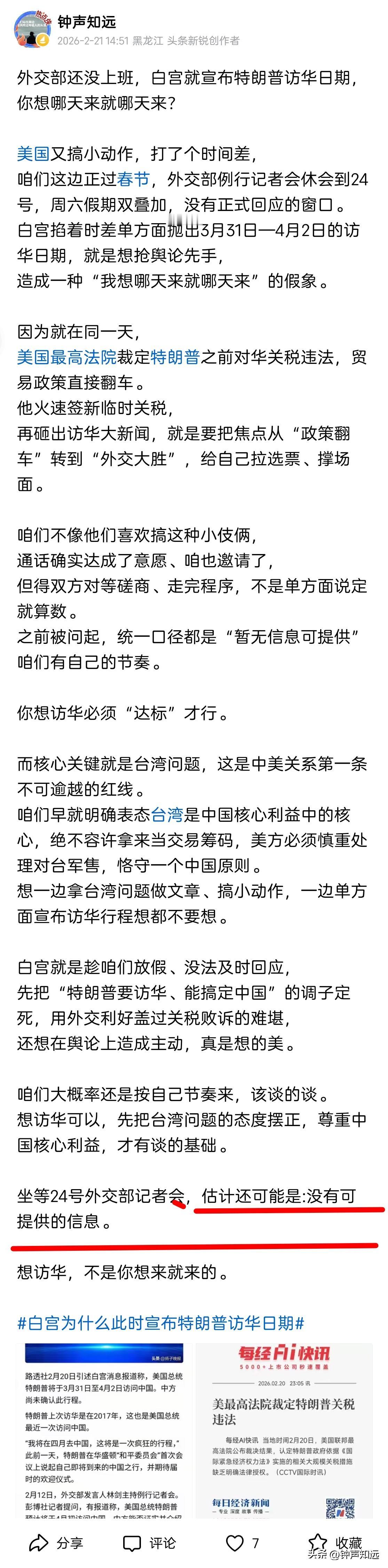 果然是“没有可以提供的信息”,特朗普想趁春节宣布访华日期,还想要大排场,想的美! 外交部复工首场记者会,对白宫单方面官宣的具体日期,还是这句经典回应:没有可以提供的信息。 之前美国单方面宣布访华日期的时候就预言过,咱们肯定不会给他好脸。咱们的回复果然不出所料。 元首访问得双方对等磋商、按程序来,不是美方趁咱们春节休假、抢时间差单方面定日子就算数的。 访华的事之前通话确实谈过,中方也重申了邀请,但日期、议程都还没敲定,美国急着造势是没用的。 最近美国最高法院判此前对华关税违法,特朗普急着签新关税、又抛访华消息,明摆着是想靠“搞定中国”转移国内压力、给自己造势。 特朗普最新讲话还说要让咱们给他搞个最高的排场,他以为他是谁,一边损害咱们利益对台军售,一边玩这种提前宣布访华日期的小伎俩,真是想的美!