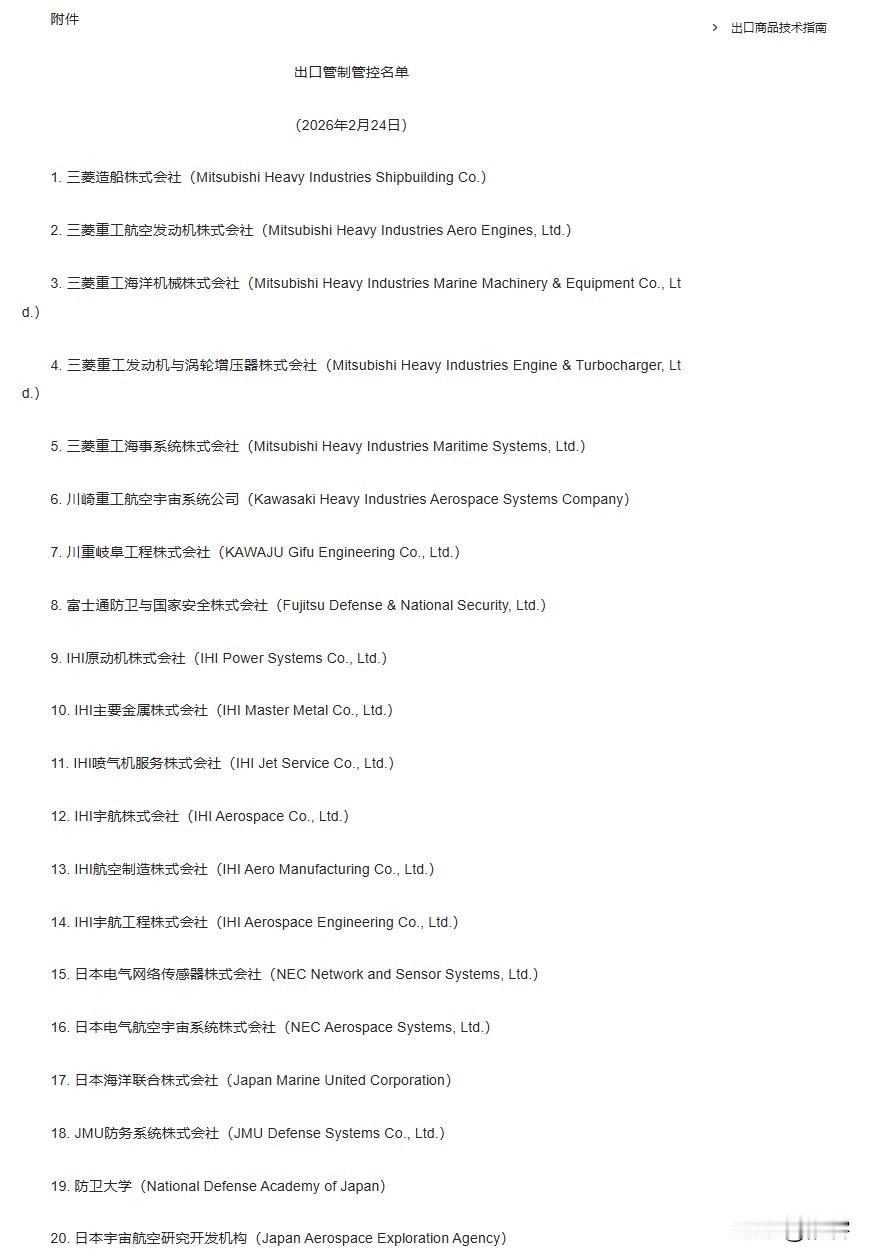 2026年注定会是充满狂风暴雨的年头。 开年第一天,中国宣布将20家日本企业纳入出口管制清单,原因是以上企业涉及日本军事相关。 之所以会是狂风暴雨般的2026年,因为当一个儒雅的翩翩君子开始动用制裁和出口管控手段,意味着到了不得不发的时候了。也代表了准备好了迎接对方的一系列反制措施和回击措施。 于此同时,目前咱们遇到的能源危机也是不可小觑的,尤其是如果美国要求伊朗停止对华出口石油后,那么咱们的石油来源不得不再一次面临缩减的命运。 附件:出口管制管控名单(2026年2月24日) 1. 三菱造船株式会社(Mitsubishi Heavy Industries Shipbuilding Co.) 2. 三菱重工航空发动机株式会社(Mitsubishi Heavy Industries Aero Engines, Ltd.) 3. 三菱重工海洋机械株式会社(Mitsubishi Heavy Industries Marine Machinery & Equipment Co., Ltd.) 4. 三菱重工发动机与涡轮增压器株式会社(Mitsubishi Heavy Industries Engine & Turbocharger, Ltd.) 5. 三菱重工海事系统株式会社(Mitsubishi Heavy Industries Maritime Systems, Ltd.) 6. 川崎重工航空宇宙系统公司(Kawasaki Heavy Industries Aerospace Systems Company) 7. 川重岐阜工程株式会社(KAWAJU Gifu Engineering Co., Ltd.) 8. 富士通防卫与国家安全株式会社(Fujitsu Defense & National Security, Ltd.) 9. IHI原动机株式会社(IHI Power Systems Co., Ltd.) 10. IHI主要金属株式会社(IHI Master Metal Co., Ltd.)11. IHI喷气机服务株式会社(IHI Jet Service Co., Ltd.) 12. IHI宇航株式会社(IHI Aerospace Co., Ltd.)13. IHI航空制造株式会社(IHI Aero Manufacturing Co., Ltd.) 14. IHI宇航工程株式会社(IHI Aerospace Engineering Co., Ltd.) 15. 日本电气网络传感器株式会社(NEC Network and Sensor Systems, Ltd.) 16. 日本电气航空宇宙系统株式会社(NEC Aerospace Systems, Ltd.)17. 日本海洋联合株式会社(Japan Marine United Corporation) 18. JMU防务系统株式会社(JMU Defense Systems Co., Ltd.) 19. 防卫大学(National Defense Academy of Japan) 20. 日本宇宙航空研究开发机构(Japan Aerospace Exploration Agency)
