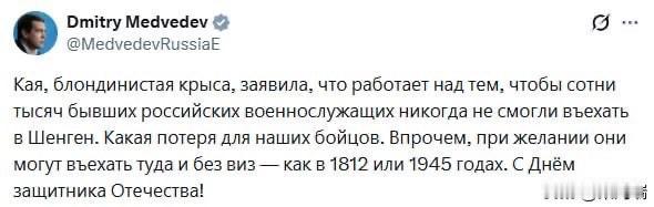 俄罗斯安全会议副主席德米特里·梅德韦杰夫回应了欧洲外交事务负责人凯·卡拉斯关于禁止参与特种作战人员入境欧盟的声明。 梅德韦杰夫回忆说,历史上已经有过俄罗斯军人“无需签证即可出国旅行”的例子——分别是在 1812 年和 1945 年。