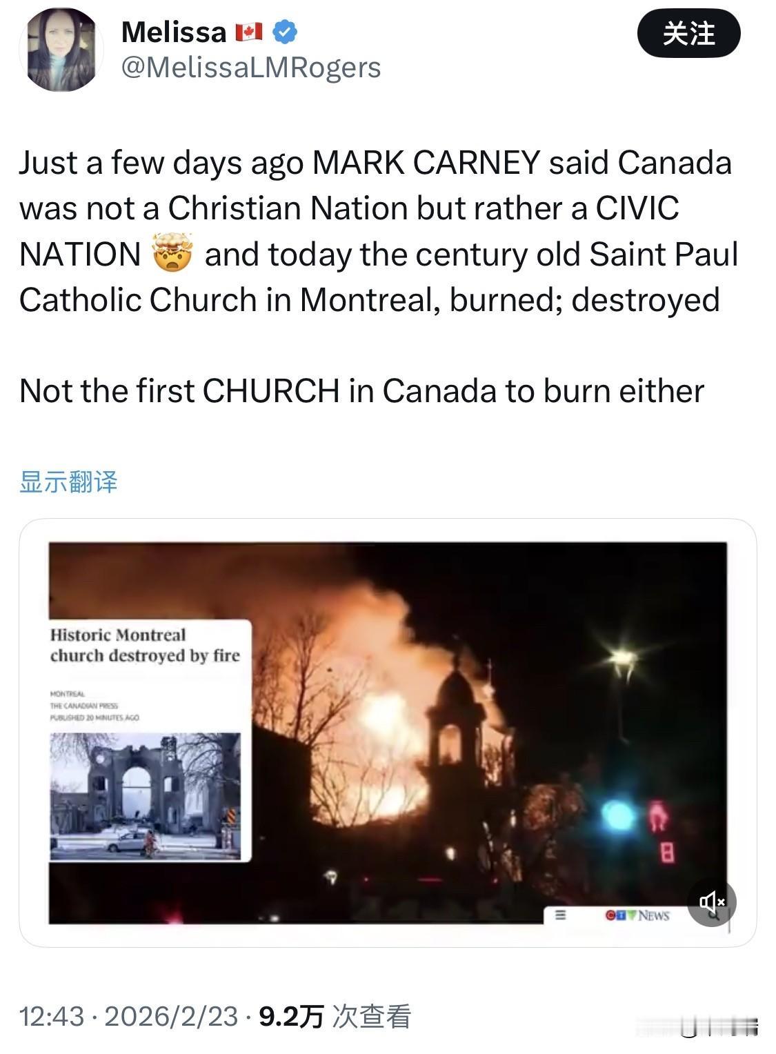 2026年2月23日凌晨,位于加拿大蒙特利尔 Sud-Ouest 区、具有百年历史的圣保罗教堂(Saint-Paul Catholic Church)遭遇特大火灾,整座建筑不幸化为废墟。 以下是此次事故的关键信息: 起火时间:火灾约在凌晨 1:30 至 1:40 之间爆发,火势迅速升级为五级大火。 人员疏散:大火迫使周边约 148 人紧急撤离,其中包括旁边由原教堂神父楼改建的养老院中的 73 名老人。目前暂无人员伤亡报告。 主要损毁: 百年古迹:该教堂建于 1910 年至 1911 年间,是当地标志性的文化遗产。 社区服务中断:长期在教堂地下室运作的 "La Main Qui Partage" 食品银行被彻底摧毁,包括其近期新购置的商业冷冻设备和所有库存食品。 火灾原因:目前具体起火原因仍在调查中。 这场大火不仅毁掉了一座宏伟的建筑,更让当地依赖该食品银行的约 200 个家庭陷入困境。