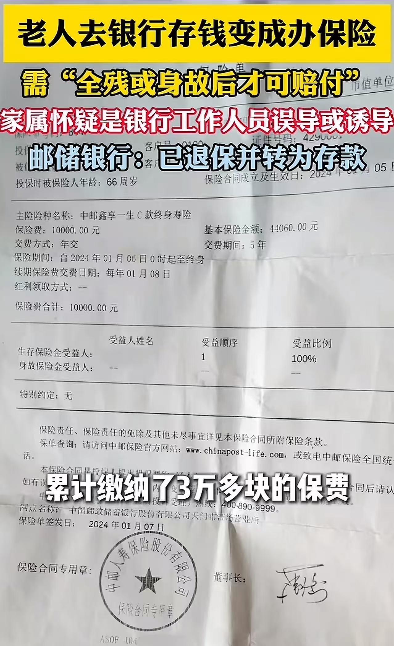 老人去银行存钱却变成办保险,需“全残或身故后才可佩服!”老人儿子:“怀疑是工作人员误导或者诱导!这还有职业道德吗?”网友:这难道不是诈骗吗?退钱就完了吗? 2024年1月,68岁的陈大妈揣着一个布包,里面整整齐齐包着三万多块钱。这是她省吃俭用攒下的养老本,本来打算存个定期,图个安稳,等几年后取出来贴补家用。 她走进了家附近的邮政储蓄银行网点。大厅里暖气很足,一位穿着制服的工作人员笑脸相迎,那热情劲儿,比亲闺女还亲。 “阿姨,您这钱存定期多亏啊!利息低得很。”工作人员一边给陈大妈倒热水,一边压低声音神秘地说,“我们行现在有个内部特供的好产品,利息比存款高多了!而且,只要存满5年,就能连本带利取出来。最关键的是,今天办理,立马送一桶沉甸甸的大豆油和一袋大米!” 陈大妈一听,眼睛亮了。送油送米,利息还高,又是银行的人推荐的,能有假?她心里那点警惕瞬间就化了。 接下来的流程快得让人眼花缭乱。工作人员递过来一叠厚厚的单子,指着几个画了圈的地方说:“阿姨,您就在这儿签个字,按个手印就行,其他的我都帮您填好了。” 陈大妈老花眼看不清那些密密麻麻的小字,心想银行还能骗人?于是,她颤巍巍地签下了名字,按下了红手印。 那一刻,她以为自己存下的是未来的保障,殊不知,她签下的一张“终身寿险保单”。 后来儿子陈先生帮母亲整理票据,才发现不对劲。 “妈,这不是存单啊!这是一份保险单!”陈先生越看脸色越难看,手指着合同条款上的几行小字,声音都抖了,“您看这儿写着呢:‘保险金需在被保险人全残或身故后方可赔付’。” 这是什么概念?也就是说,除非母亲瘫痪在床或者去世,否则这笔钱根本取不出来!所谓的"5年期满取款”,完全是工作人员当初口头忽悠的谎言。那三万多的养老钱,就这样被锁死了,变成了给保险公司交的保费。 “这是要把老人的养老钱,变成买命钱啊!”陈先生气得直跺脚,“我妈当时就是冲着存款去的,要是知道是这种保险,打死她也不会签!这工作人员还有没有职业道德?这不是明摆着欺负老人看不懂字、听不懂术语吗?” 陈先生拿着证据去找银行理论。起初,银行方面的回应冷冰冰的:“经过内部调查,办理时已明确告知是保险,签名也是老人亲笔,不存在误导。” 这话听着真让人寒心。一个68岁的老人,面对专业的金融术语和热情的推销攻势,所谓的“告知”真的有效吗?那桶诱饵般的食用油,难道不是精心设计的陷阱吗? 在陈先生据理力争、甚至准备向监管部门投诉的压力下,事情终于有了转机。银行最终松口,承认在销售过程中存在瑕疵。经过多轮协商,银行同意为陈大妈办理全额退保,将那三万多块钱原封不动地转回了存款账户。 虽然钱回来了,但陈大妈心里的疙瘩却解不开。她看着那桶还没吃完的油,后怕得直抹眼泪:“差点就把自己的后路给断了。” 【网友热议】 “我姐姐也是这样的,我还了姐姐的五万块钱,她去银行存款,遇到了这样子的推销理财产品,并且签完单了,想起来问我一下,我知道上当了,当即给姐姐出主意:大叫大闹,一哭二闹三上吊!果然是有效,银行马上把理财变成存款单了!” “2004年我在银行储蓄所也是这样被骗买了保险,还说是赠了一份保险,当时我们女儿上大学回来让她看了看,他说不是赠的保险就是买的保险,到70岁才能支取本息!这种操作有失诚信缺德下三滥让人气愤。” “为什么银行里面允许这种诈骗?退钱就可以了吗?凡误导储户的在职人员一律开除,这就是欺诈行为,我国法律是不允许的。” 我认为,这件事虽然以“全额退保”圆满收场,但它撕开了一个血淋淋的真相:在银行柜台前,很多老人根本不是去办业务的,而是去当“猎物”的。 所谓的“存款变保险”,从来都不是什么“误会”,而是一场精心策划的降维打击。 银行工作人员利用信息差,把复杂的保险条款简化成“高息存款”,用米面油这种廉价的小恩小惠作为诱饵,精准收割那些视力模糊、听力下降、对金融知识一无所知的老年人。他们赌的就是老人不敢赖账、子女发现得晚、维权成本高。 最讽刺的是什么?是银行出了事第一反应往往是“甩锅”——“字是你签的,手印是你按的,概不负责”。直到家属闹大了、媒体曝光了、监管介入了,才肯吐出那块到嘴的肉。 对于这种现象,不能止于“个案解决”。只要“存款变保险”的提成诱惑还在,只要对违规销售的惩罚力度远小于获利空间,这种针对老年人的“围猎”就永远不会停止。 别等到老人真的因为没钱治病而陷入绝境时,我们才来感叹“人心不古”。保护老人的钱袋子,不能靠子女的火眼金睛,必须靠把那些伸向老人的黑手,彻底剁掉! (来源:小强热线)