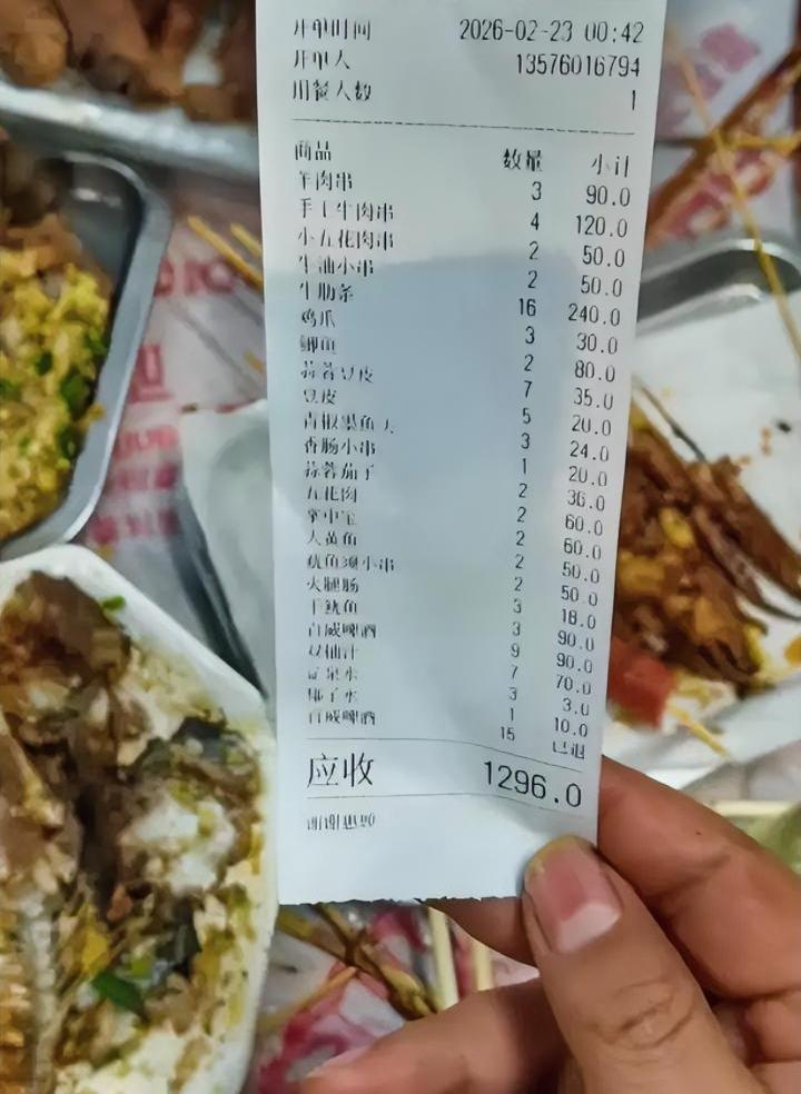 这算被宰了吗? 吃烧烤火腿肠6元一根、鸡爪10元、豆皮4元、五花肉30元…… 一顿简单的烧烤,总计花了1296元,这在我们这里,三四个人够吃五六顿了。 不过话说回来,以后吃饭前一定看好菜价,不要最后到付账时觉得被宰了,问清楚价格真不丢人。