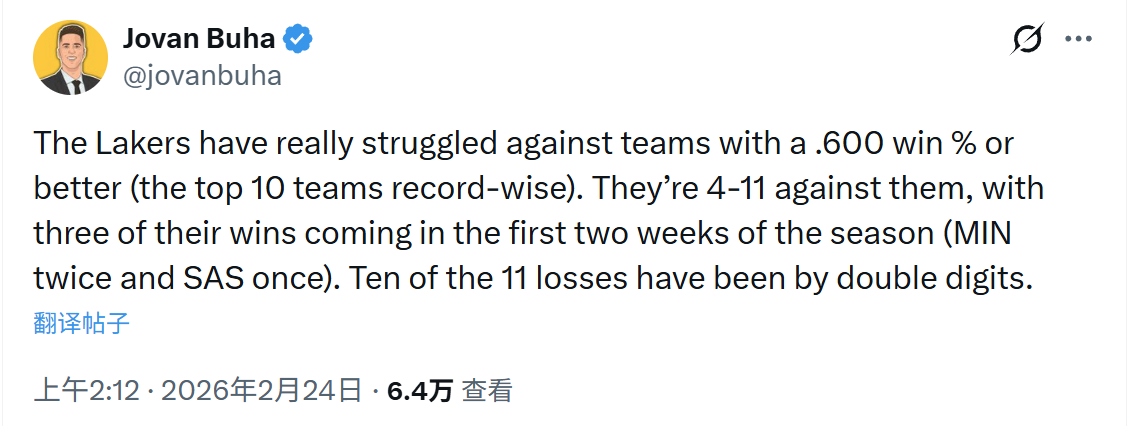 Jovan Buha:湖人面对胜率达到或超过60%的球队(战绩排名前十)时表现挣扎,4胜11负。其中3场胜利是在赛季前两周取得的(2次战胜森林狼,1次战胜马刺)。11场失利中有10场分差达到两位数。
