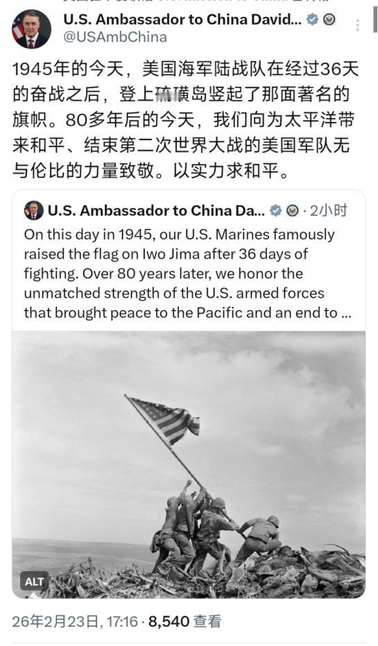 美国驻华大使庞德伟2月23日发文写道:“1945年的今天,美国海军陆战队在经过36天的奋战之后,登上硫磺岛竖起了那面著名的旗帜。80多年后的今天,我们向为太平洋带来和平、结束第二次世界大战的美国军队无与伦比的力量致敬。以实力求和平。” 这话听着挺好听,念着美国士兵的牺牲,说着和平的重要性,但有个最关键的事儿,他从头到尾一个字没提——当年这场打得死去活来的硫磺岛战役,美国到底是跟谁打的? 咱们不翻旧账,但也不能忘历史。稍微有点年纪的人都知道,1945年那时候,第二次世界大战还没结束,太平洋战场上,美国的主要对手就是日本。 那场硫磺岛战役,是美国和日本实打实的硬仗,打了36天,打得有多惨?美军死了6800多人,伤了2万多人,日军几乎全军覆没,死了2万2千多人,这是太平洋战争里,登陆方伤亡比防守方还多的唯一一场战役。 当年美国打这场仗,目的很明确,就是要打垮日本军国主义,拿下硫磺岛这个战略要地,既能轰炸日本本土,也能为进攻日本本土铺路,最终结束二战的战火。那些牺牲的美国士兵,确实值得纪念,他们当年是为了反法西斯、为了和平去战斗的,这份牺牲不能被忘记。 可庞德伟的发文里,只字不提日本,不提这场仗是为了消灭日本军国主义,反而一个劲夸美国军队的“无与伦比的力量”,说“以实力求和平”。这就有点说不过去了——连当年跟谁打仗、为什么打仗都不敢提,谈什么纪念牺牲、守护和平? 更让人不舒服的是,美国一边在这里纪念硫磺岛战役的牺牲士兵,一边干着纵容日本的事儿,完全忘了当年为什么要打那场仗,也忘了战后秩序是怎么来的。 当年二战结束后,为了防止日本军国主义死灰复燃,国际社会制定了战后秩序,还帮日本制定了和平宪法,其中第九条明确规定,日本永远放弃战争,不保有陆海空军和其他战争力量。 这本来是为了约束日本,不让它再搞侵略,不让当年的悲剧重演,美国作为当年反法西斯的主要国家,也是战后秩序的制定者之一,本该好好维护这个秩序。 可现实呢?从冷战开始,美国就变了心思。为了自己的霸权,它不再遏制日本,反而开始纵容日本扩军。1954年,在美国的默许之下,日本成立了自卫队,名义上是自卫,实际上就是军队,这已经违背了和平宪法的初衷。 后来,美国还一步步给日本松绑,2014年允许日本解禁集体自卫权,也就是说,日本可以派兵去海外打仗了;2024年,美日还升级了安保条约,让日本从原来的辅助美国,变成了可以和美国一起进攻的伙伴。 这些年,美国更是变本加厉,直接给日本出售先进武器。2024年,美日签了合同,要在2025到2027年之间,给日本交付400枚战斧巡航导弹,这种导弹射程能到1600公里,攻击性极强。 除此之外,美国还帮日本改造航母,一起研发新型导弹,默许日本增加防卫费,2025年日本的防卫费已经突破了GDP的1%,还在不断扩充军事力量。 更可笑的是,当年二战结束后,《波茨坦公告》明确要求严惩日本战犯,可美国没过多久,就把那些被判了刑的日本战犯全都释放了,连无期徒刑的甲级战犯也没放过,这本身就违背了当年的约定,也为后来日本军国主义抬头埋下了隐患。 现在的日本,越来越嚣张,首相高市早苗公然干涉中国内政,把台湾问题和日本的“存亡危机”挂钩,还暗示要动用武力;日本国内的右翼势力也越来越活跃,不断否认侵略历史,祭拜靖国神社里的战犯。这一切,背后都有美国的影子,如果不是美国纵容,日本根本不敢这么做。 美国总说自己是“屠龙者”,当年打败了日本军国主义这条“恶龙”,可现在呢?它却在亲手喂养这条曾经被打败的“恶龙”,把日本绑在自己的霸权战车上,让日本成为自己围堵其他国家的棋子。这哪里是“以实力求和平”,分明是以实力搞霸权,以纵容搞对抗。 当年硫磺岛战役的牺牲,不是为了让美国现在纵容日本扩军,不是为了让美国破坏自己亲手建立的战后秩序,更不是为了让军国主义死灰复燃。那些牺牲的美国士兵,如果泉下有知,看到美国现在的所作所为,恐怕也不会安息。 其实大家心里都清楚,真正的和平,不是靠实力威慑,更不是靠纵容战败国扩军。如果曾经的“屠龙者”不想变成自己当年反对的“恶龙”,首先就要守住底线,维护好战后秩序,严格约束日本,不让军国主义卷土重来。 美国现在的做法,不仅破坏了地区和平稳定,也对不起当年在硫磺岛牺牲的士兵,更对不起当年所有为反法西斯战争付出的人。 美国要是真想起念当年的牺牲,真想去守护和平,就别再回避历史,别再纵容日本扩军,好好维护战后秩序,这才是对当年牺牲士兵最好的纪念,也是真正的“以实力求和平”。不然,再怎么喊口号,也都是假的,只会遭到全世界热爱和平的人的反对。