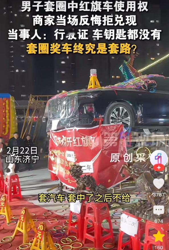 山东济宁,一男子花了5600元,套中了一辆红旗轿车,谁知商家却突然表示,车子不是在本人名下,自己也没有车钥匙,于是男子选择了报警求助,最终,经过协调商家退还了男子5600元套圈费用,事发后,网友则坐不住了,纷纷表示商家玩不起。   街头巷尾的套圈游戏,本是供人消遣娱乐的小事,可山东济宁一处摊位上发生的事,却让人越看越气愤,一桩看似普通的套圈中奖,竟藏着商家的失信与耍赖,更让参与者寒了心。   不同于寻常套圈摊只摆些玩具、玩偶,济宁当地的夜市和集市上,有一处摊位格外扎眼,摊主没有走常规路线,反倒把现金奖励和一辆红旗轿车摆了出来,明晃晃地当作最大噱头吸引路人驻足。   摊位前的规则写得清清楚楚,套圈一元一个,只要套中指定的三脚架,单次就能拿到288元现金奖励,若是能成功套中三次,就可以直接获得这辆红旗轿车两年的使用权。   这样的高额诱惑,很快就吸引了不少围观群众,本地男子周先生也是其中之一。   他平日里就对自己的套圈技术有些自信,再加上看着那辆红旗轿车实在心动,没多犹豫就动了参与的念头,一口气掏出5600元,买了足足5600个套圈,打算试着冲击这份大奖。   周围的人见状纷纷凑过来起哄加油,有人觉得周先生太冲动,花这么多钱套圈太不划算,也有人期待着能看到有人真的套中大奖。   可谁也没想到,周先生的手气竟出奇的好,还没等他把手里的5600个套圈全部用完,就成功套中了指定的三脚架三次,妥妥地达到了兑换红旗轿车两年使用权的条件。   中奖的那一刻,周围响起一阵欢呼声,周先生也难掩喜悦,原本以为自己花的钱物有所值,能顺顺利利拿到车辆使用权。   可让人始料未及的是,一旁的摊主脸色瞬间变了样,刚才还热情招呼路人、吆喝着游戏规则的劲头彻底消失,取而代之的是支支吾吾的推脱和敷衍。   面对周先生的兑奖要求,摊主开始找各种借口耍赖,一会儿说这辆红旗轿车根本不是他本人的,他没有权利把车交给周先生使用;一会儿又改口说车辆的主人已经出国了,他手里既没有车钥匙,也没有车辆行驶证,就算周先生中了奖,也根本开不走车子。   翻来覆去就一个意思,承诺好的红旗轿车使用权,根本无法兑现。   周先生见状,心里的喜悦瞬间被浇灭,换成了满满的无奈和气愤。   他知道摊主这是明显的玩不起,可也没想着过多纠缠,只想着既然无法兑现奖品,那自己花的5600元套圈费用,摊主总该退给自己,毕竟他之所以花这么多钱,全是冲着这辆红旗轿车来的。   可让周先生没想到的是,摊主的耍赖程度远超他的预料,不仅坚决拒绝兑现车辆使用权,就连退还套圈本金的要求也一口回绝,态度强硬地表示,车没有,钱也一分不退。   这样的态度,彻底激怒了周先生,他明白和这样不讲诚信的摊主再多协商也没用,当即拿出手机,选择了报警求助,希望民警能帮自己讨回公道。   民警赶到现场后,很快就问清了事情的来龙去脉,看着摊主支支吾吾、神色心虚的样子,不用过多询问,也能猜到其中的缘由。   民警当即对摊主进行了批评教育,明确告知他,既然公示了游戏规则,就应该严格履行承诺,耍赖拒兑奖、拒不退钱的行为,既不合情理,也涉嫌违规。   经过民警的耐心协调和劝说,摊主最终松了口,不情愿地将周先生花费的5600元套圈费用全额退还。   至此,这场因套圈中奖引发的纠纷,才算暂时平息,周先生虽然没能拿到心心念念的红旗轿车使用权,但总算是拿回了自己的本金,没有造成更大的损失。   这件事里,摊主的做法实在让人不齿。   既然敢把红旗轿车当作大奖摆出来,就该有兑现承诺的底气,若是从一开始就没打算兑奖,只是想靠高额噱头骗取路人的套圈费用,那就是赤裸裸的失信,更是对参与者的不尊重。   周先生花5600元套中红旗轿车,商家却以车辆非本人所有、无车钥匙为由拒兑,最终在民警协调下退还5600元本金,这样的结果,虽然让周先生拿回了本金,却也难免让人觉得憋屈。   毕竟周先生是按规则参与游戏、成功中奖,理应获得相应的奖励,而不是只能拿回自己的本金,白白耗费了时间和精力。   今天的分享到这里就结束了,大家对此事有何看法,欢迎在评论区留言和讨论,感兴趣的可以点击头像加关注,我将每日更新优质内容,我们下期见。