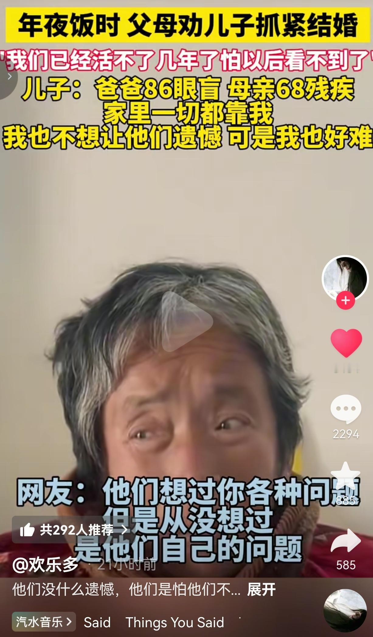 别催了!这种家庭有什么可催的呢?年夜饭的桌子上,本该是热气腾腾的团圆饭,可这家人的饭桌上,却压着千斤重的心事。 男子的母亲,68岁,身有残疾,脸上布满了岁月的痕迹,眼神里满是焦灼。男子的父亲,86岁,是一位盲人。 在今年的年夜饭上,她和86岁眼盲的老伴,反复念叨:“我们已经活不了几年了,怕以后看不到你结婚了。” 而置于两难境地的儿子,承受着这个家的全部重量——父亲眼盲,母亲残疾,家里的一切都靠他撑着。他说:“我也不想让他们遗憾,可是我也好难。” 网友看到后评论说:“别催了!这种家庭有什么可催的呢?他一个人撑着全家都快撑不住了,再催婚,是想把他压垮吗?” 也有的网友说:“真的心疼这个男的。他不是不想结,是他结不起啊!谁愿意跟着他一起伺候两个老人,过这种看不到头的日子?” 还有的网友说:“有些父母就是这样,把自己的执念当成孩子的责任。他们活不了几年,可孩子还要活几十年啊!” 说句掏心窝子的话,看完这事儿,心里堵得慌。 这事儿真没法简单站在哪一边指责谁。 做父母的,86岁眼盲的老父亲,68岁残疾的老母亲,他们的焦虑是实打实的。人到了这个岁数,眼睛看不见、身子动不了,最大的念想就是看着儿子有个伴。他们怕自己闭眼后,儿子孤零零一个人,连个端茶倒水、知冷知热的人都没有。那句“活不了几年了”,听着扎心,可这就是老人眼里最朴素的牵挂,没有半点坏心眼。 可咱们再看看这儿子,他太难了,难到让人不忍心苛责一句。 上有八旬盲父、花甲残母,家里里里外外的大小事,全靠他一个人扛。他不是不想成家,不是不懂父母的心思,是现实的担子压得他不敢想。结婚不是领个证那么简单,那是柴米油盐的琐碎,是两个人并肩过日子的底气。他连照顾父母都要拼尽全力,又哪里来的勇气,去拉一个外人进来一起扛这份沉重? 其实啊,这事儿最让人难受的,就是这份“爱与为难”的错位。父母的爱,成了儿子的枷锁;儿子的孝,成了自己的牵绊。 在我看来,这家人最该做的,不是催,而是“懂”。 父母该懂,儿子的“难”,是生活的重压,不是不想孝。与其揪着“结婚”的执念,不如好好享受当下的团圆——有儿子在身边端饭喂水、遮风挡雨,这本身就是最大的福气。 而儿子的“难”,也不妨多跟父母说说。或许不用讲太多大道理,就把自己的疲惫、自己的顾虑摊开了说,让老人知道,不是他不想,是他在等一个合适的时机,更是在对自己、对未来的另一半负责。 婚姻从来不是完成父母遗憾的工具,更不是衡量孝顺的标准。能把风雨飘摇的家撑起来,能守着年迈多病的父母尽孝,这个儿子,已经做得足够好了。 别催了,真的。让这顿年夜饭,少点沉重的期盼,多点实实在在的温暖吧。 大家觉得呢?欢迎大家评论区讨论留言。