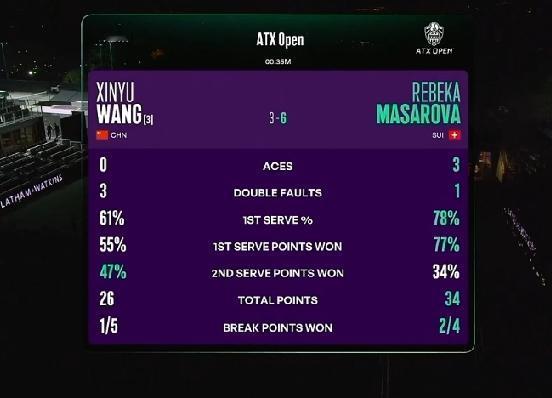 WTA250奥斯汀站,王欣瑜首轮第一场比赛。王欣瑜3:6马萨洛娃,赛后统计显示,王欣瑜几乎在所有数据上都是落后的一方。抬手就是ue,看到现场郑赛赛和她的团队成员都包裹着厚厚的羽绒服,难道是还没有完全热身开来,才没有手感的? 对手马萨洛娃是资格赛球员,前面已经打过比赛了,也很好的适应了比赛场地和当地的气候。 话说接下去就是北美阳光双赛了,奥斯汀站的气温咋还这么低,挑这站比赛热身会不会适得其反啊?一个这么冷,一个这么热?