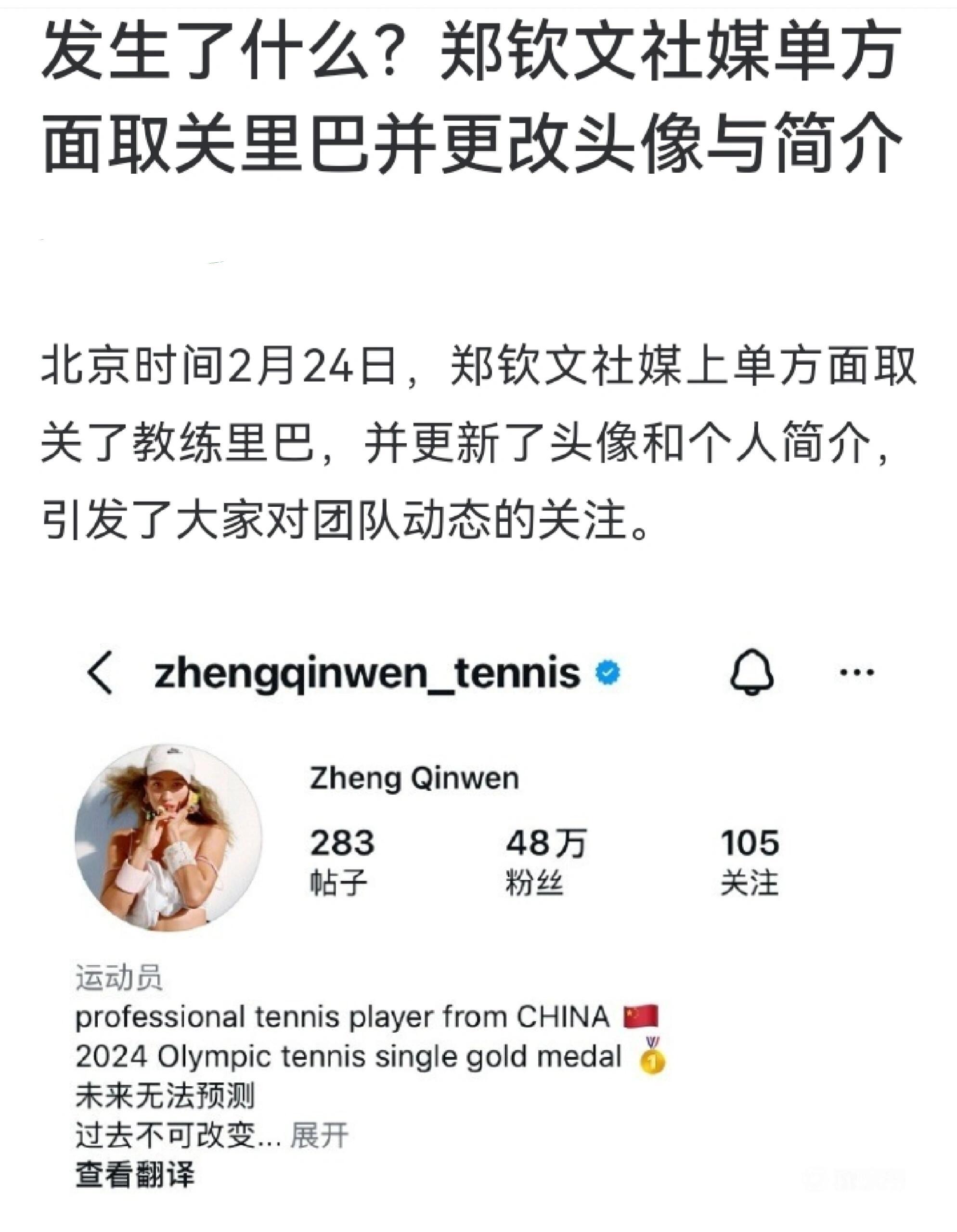 郑钦文取关里巴教练北京时间2月24日,郑钦文社媒上单方面取关了教练里巴,并更新了头像和个人简介,引发了大家对团队动态的关注。郑钦文更换了社媒的头像,并且在简介里增加了一句尼采的名言:“He who has a why to live can bear almost any how”(一个人知道自己为什么而活,就可以承受任何一种生活)。郑钦文的关注列表里已经没有里巴,而里巴未取关郑钦文。郑钦文与里巴于2021年开始合作,期间其世界排名由100名外升至前30名,双方于2023年6月结束初次合作。2023年底,在结束与教练费塞特的合作后,郑钦文主动联系里巴恢复合作关系。在里巴的执教下,郑钦文在2024赛季获得了澳网亚军及巴黎奥运会网球女单金牌,年终排名达到世界第五。2024年11月,里巴因接受髋关节手术暂时离队休养,随后于2025年2月底伤愈回归团队。