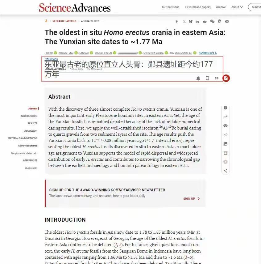 177万年!湖北郧县人改写东亚古人类历史 2026年2月18日,国际期刊《科学进展》发表了一项重要研究。 专家通过最新的测年技术,确认湖北郧县出土的直立人头骨化石,距今已有177万年。 这是目前东亚地区,从明确地层里原位发掘出来的最早直立人化石。 这一结果,把学界对东亚古人类的认识,向前推进了大约60万年。 其实郧县人的发现,已经有几十年的历史。 上世纪八九十年代,考古人员就在当地学堂梁子遗址,挖出过两具直立人头骨。 当时这两具头骨就引起了广泛关注,只是年代一直没有定论。 受限于当时的技术条件,不同研究得出的结果差距很大。 有人认为距今60万年,也有人认为接近110万年。 因为说法不一,郧县人生活的具体时代,长期存在争议。 到了2021年和2022年,考古工作有了新突破。 研究团队再次开展发掘,又找到了第三具直立人头骨。 这具头骨比前两具更加完整,保存状态更好,研究价值也更高。 和头骨一起出土的,还有大量古人使用的石器,以及多种动物化石。 这些遗存都出自同一地层,互相之间可以印证,为准确测定年代提供了很好的基础。 这次能得出精确年代,主要依靠一种更稳定的新技术。 简单来说,就是利用石英样品里的元素衰变规律,计算化石的埋藏时间。 研究人员对同一层的多件样品进行了综合分析,尽量排除外界干扰。 得出的177万年结果,还和古地磁测定的数据相互吻合,可信度比较高。 在这之前,东亚地区被普遍认可的最早直立人,是陕西蓝田人。 蓝田人的可靠年代,大约在163万年。 郧县人的年代,比蓝田人还要更早一些。 大家熟知的元谋人,虽然有更早的推测,但地层信息不够明确,说服力相对有限。 综合来看,郧县人目前在东亚直立人里,年代最早,证据也更清晰。 这一发现,也让人们对早期人类的扩散过程有了新理解。 目前学界普遍认为,直立人大约在190万年前出现在非洲。 按照郧县人的年代推算,直立人走出非洲后,只用十多万年就扩散到了东亚。 这说明早期人类的扩散速度,比过去想象的要快。 同时,郧县人头骨的形态有自己的特点。 和其他地区的直立人相比,存在明显区别。 这也说明,早在177万年前,东亚地区的古人类,已经出现了形态上的多样性。