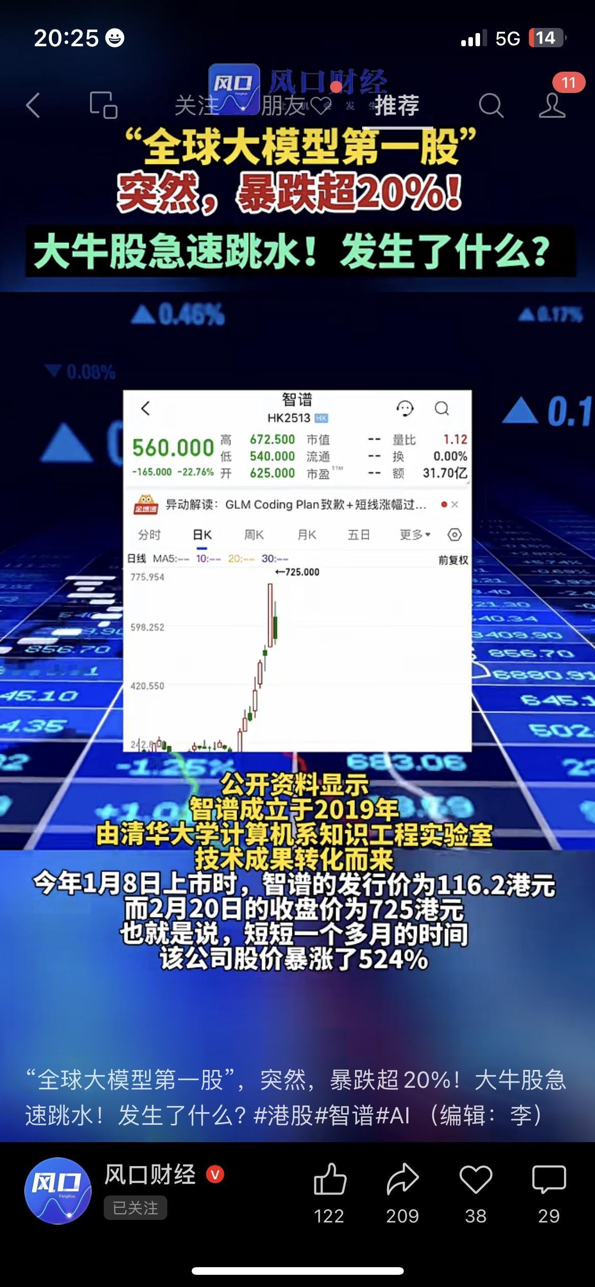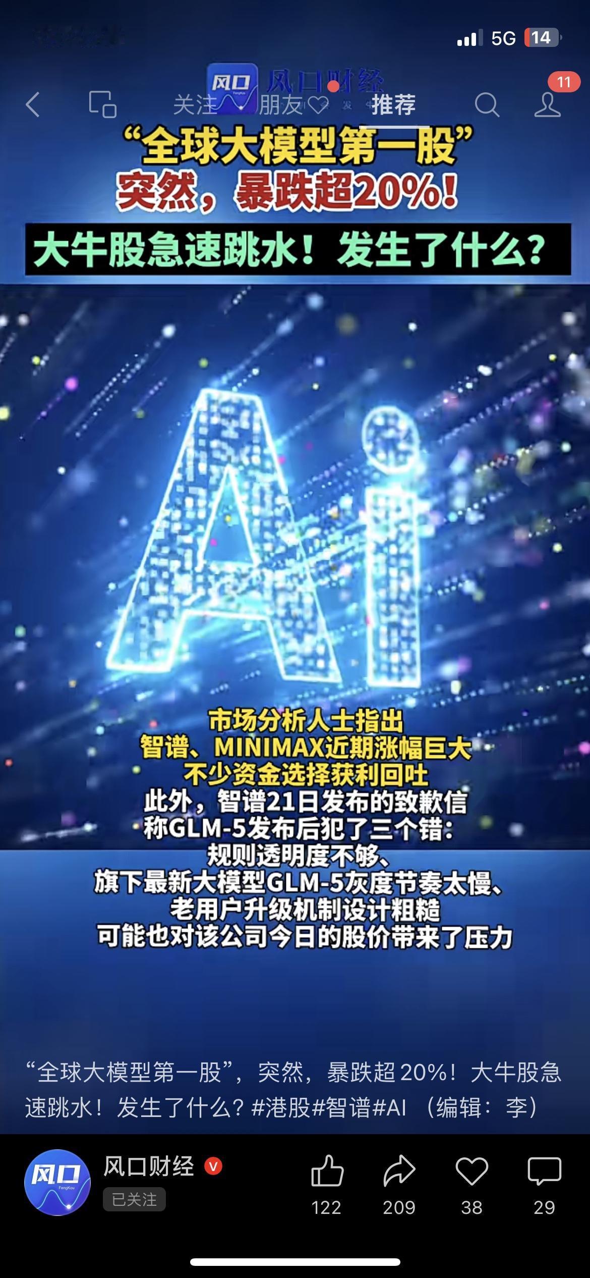 炸了!“全球大模型第一股”智谱今天在港股崩了,盘中暴跌超25%,收盘也跌了22.76%。 我刷到的时候,办公室同事都在喊:“这才一个多月,从116.2涨到725,又直接砸下来,太刺激了。”我赶紧把购物车里的AI股删了,心里咯噔一下。 说白了,暴跌的直接导火索,就是智谱21日发的那封道歉信,承认在GLM-5发布后犯了三个错: • 规则透明度不够,用户不知道升级标准 • 灰度节奏太慢,新模型迟迟不开放 • 老用户升级机制设计粗糙,体验极差 再加上前期涨得太猛,从1月8日上市到2月20日,短短43天暴涨524%,资金获利回吐的压力本来就大,道歉信一出来,直接成了压垮股价的最后一根稻草。 咱普通人看这事,别光看热闹。AI股的逻辑从来不是“概念越火越涨”,而是“落地越实越稳”。智谱这次,就是用真金白银给所有追热点的人上了一课:没有业绩支撑的暴涨,最终都是镜花水月。 市场有风险,投资需谨慎。本文仅为信息分享,不构成任何投资建议,据此操作风险自担。 智谱 AI 港股 大模型 投资提醒智谱IPO