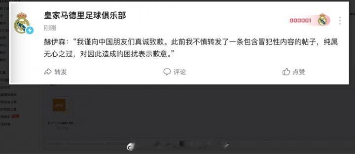 据博主“IGotCroatianFever”微博晒图,中国皇马球迷联盟发给皇马的邮件得到了回复,说是球员已经通过中国的社媒向中国球迷道歉了! 是的!是在中国社媒上道歉!这就有如众目睽睽之下辱骂你,然后在私下,在不准录视频,不准直播,就这样让另外一个不相关的人举着“对不起”的道歉纸牌,而他本人却没有出场的唯独别人知道的道歉。 这样的道歉确实很牛!还想怎么样? “GloryTag 荣耀印记” 的在西班牙的球迷发视频说:他举着牌子想要找赫伊森给个说法,可是赫伊森一见到,立即就加大油门就跑了。 看来赫伊森知道自己做的事很不对,没有脸见人啊!