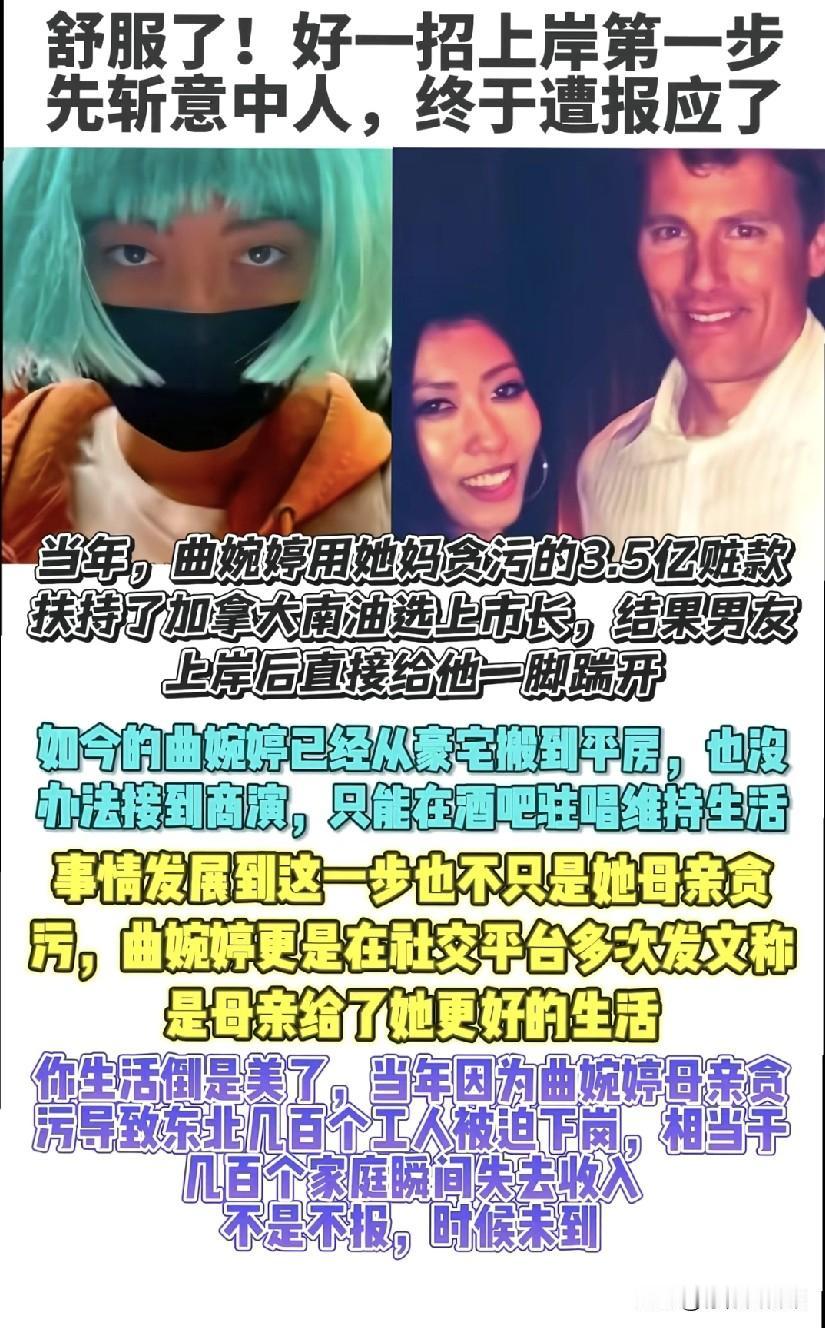 家人们,大瓜更新了!之前想回国复出被全网冲爆的曲婉婷,现在又被爆惨状:靠着她妈贪污的3.5亿下岗职工安置费在加拿大挥霍,结果被加拿大前男友罗品信甩了,账户里的钱还被卷走,直接跌入“斩杀线”。 你说这事儿讽刺不讽刺?当年她妈把下岗工人的血汗钱揣进腰包,供她在国外住豪宅、开演唱会,她还公开为她妈喊冤,说什么“母亲是英雄”。现在呢?钱没了,人也凉了,想回国捞爱国饭,结果账号刚开一天就被封,连头像都没留下。 大众无法原谅她的,从来不是她的出身,而是她的立场和态度。那些被她妈毁掉的家庭,那些下岗工人的血泪,互联网都记得清清楚楚。 现在她在加拿大从豪宅搬到平民公寓,甚至被传去酒吧驻唱度日。只能说,出来混迟早要还的,这波纯属因果循环,一点都不冤。 曲婉婷跌落斩杀线