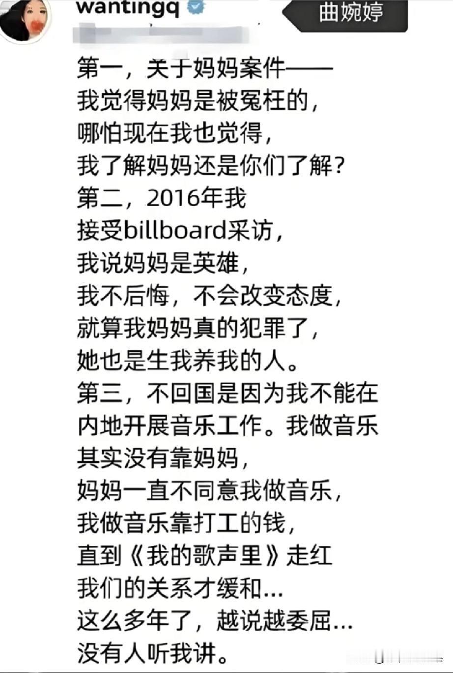 家人们,大瓜更新了!之前想回国复出被全网冲爆的曲婉婷,现在又被爆惨状:靠着她妈贪