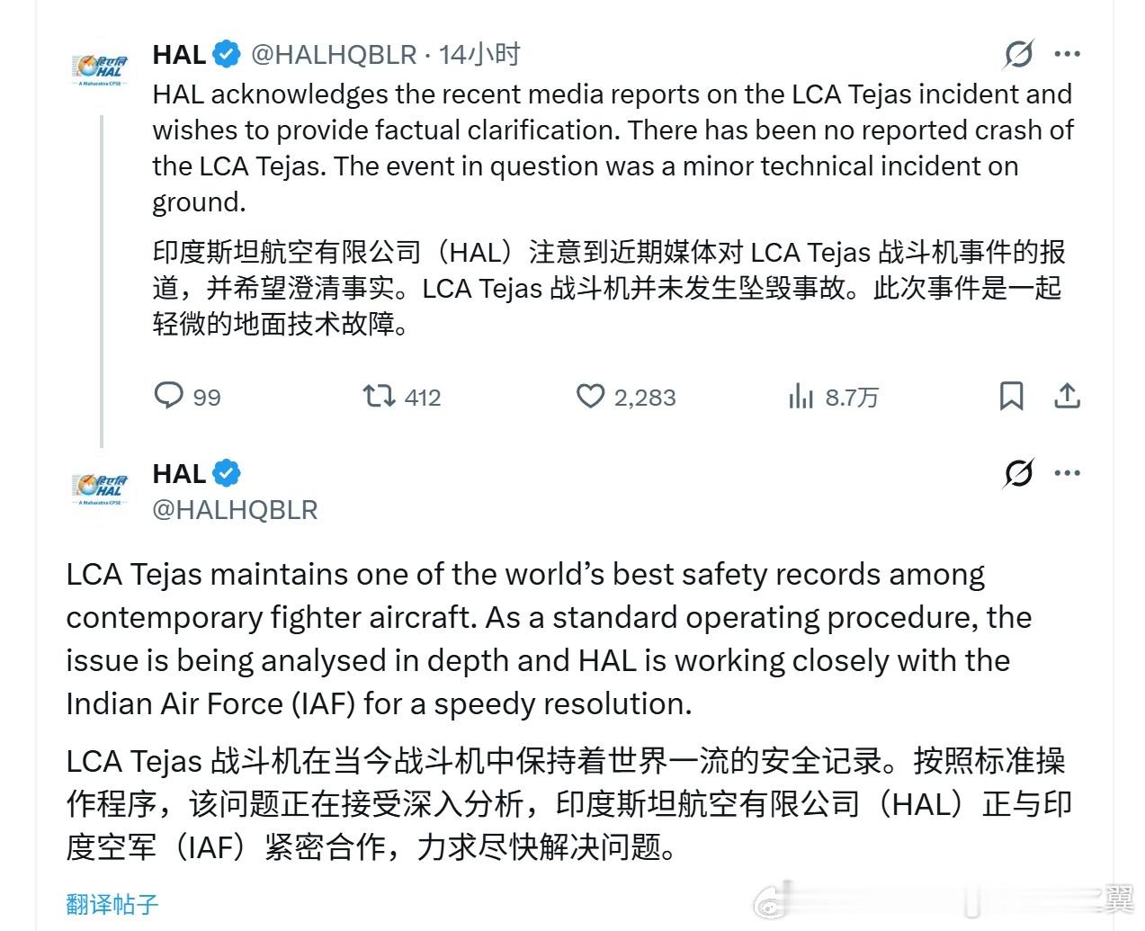 印度光辉战机又坠毁 光辉印度斯坦飞机公司(HAL)在光辉战斗机第三次坠机后首次发声,称“此次事件是一起轻微的地面技术故障”(该机全损),“光辉战斗机在当今战斗机中保持着世界一流的安全记录”。