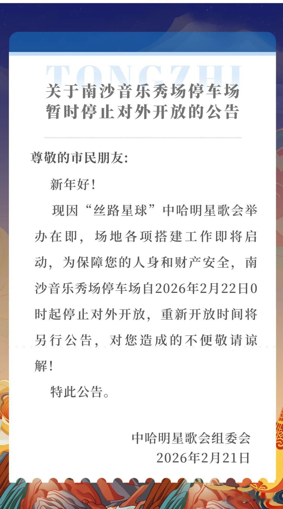 【看灯会停车请注意!这个停车场暂停开放】这几天要去看灯会的要注意了!因“丝路星球”中哈明星歌会举办在即,场地各项搭建工作即将启动,为保障您的人身和财产安全,南沙音乐秀场停车场自2026年2月22日0时起停止对外开放,重新开放时间将另行公告。 考虑到“丝路星球”中哈明星歌会要到3月1日才结束,加上拆除也需要点时间。去看灯会的记得要找其他的停车场了。 从早前公布的停车攻略可以看到,南沙音乐秀场停车场提供750个车位,暂停开放的话,意味着在南沙灯会的正门,只剩下一个停车场可以用了。 而且到时候歌会+灯会双活动叠加,预计人和车会更多,建议不急的,可以错开赏灯哦。
