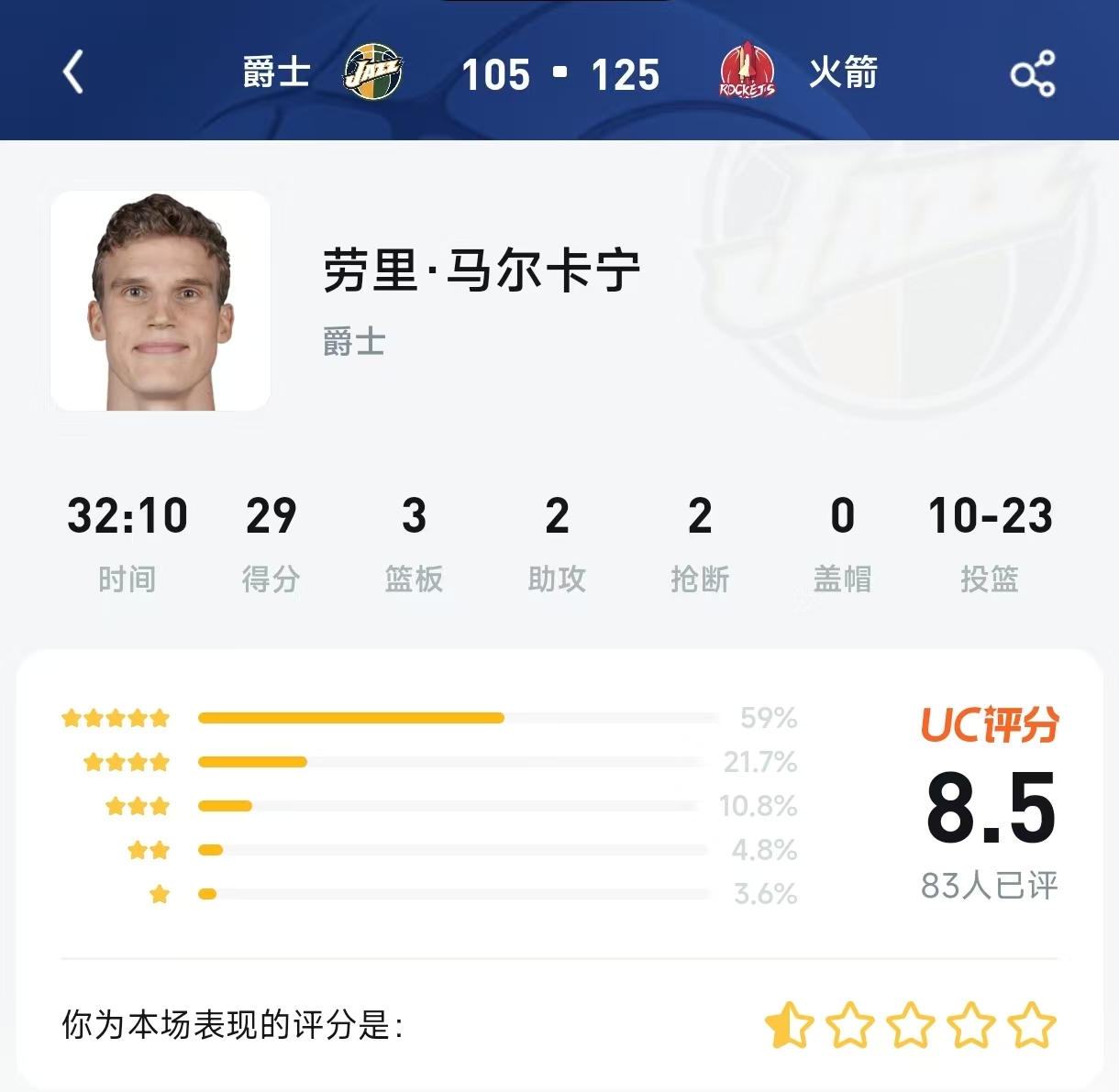 ① 原始评分截图(文字还原) 比赛信息:爵士 105 - 125 火箭 球员:劳里·马尔卡宁(爵士队) 球员数据:时间 32:10 | 得分 29 | 篮板 3 | 助攻 2 | 抢断 2 | 盖帽 0 | 投篮 10-23 评分分布:5星 59% | 4星 21.7% | 3星 10.8% | 2星 4.8% | 1星 3.6% UC评分:8.5 | 评价人数 83人已评 用户评分入口:你为本场表现的评分是:(五星已点亮)