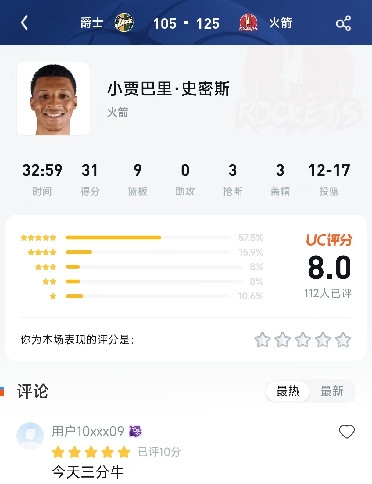 防守端:被低估的铁闸 今天的评分区有10.6%的人给了1星,这些人可能只看了他0助攻的数据,觉得他“独”。但他们忽略了那3个盖帽和3个抢断。在比赛第二节,当爵士试图反扑时,是小史密斯的防守覆盖面积限制了马尔卡宁的冲击。他不再是那个容易被晃起的新秀,他的横移速度让爵士的锋线苦不堪言。这种在防守端的影响力,才是火箭教练组最想看到的。